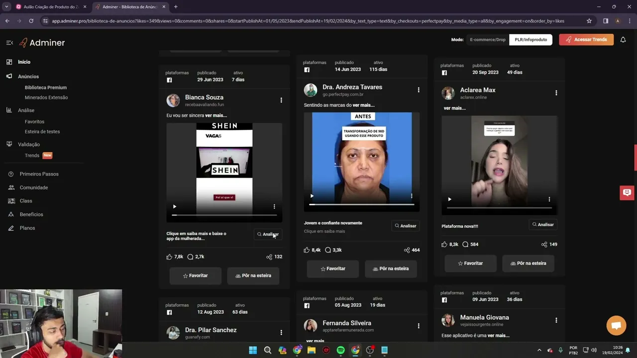 20 vamos esperar carregar É provavelmente já tá fora doar o próximo site deixa eu continuar analisando aqui deixa eu ver se é o mesmo domínio aqui já é outro domínio também Tá desativado Vamos fazer assim vamos pegar o nome do produto no caso o nome do produto tá sendo qual avaliador aqui é a biblioteca de anúncio tá então todos os anúncios que estão rodando agora vão aparecer aqui então você pesquisa aqui o nome do produto e aqui você clica aqui no caso na biblioteca já é anúncio que tá realmente ativo então percebe aqui a Data