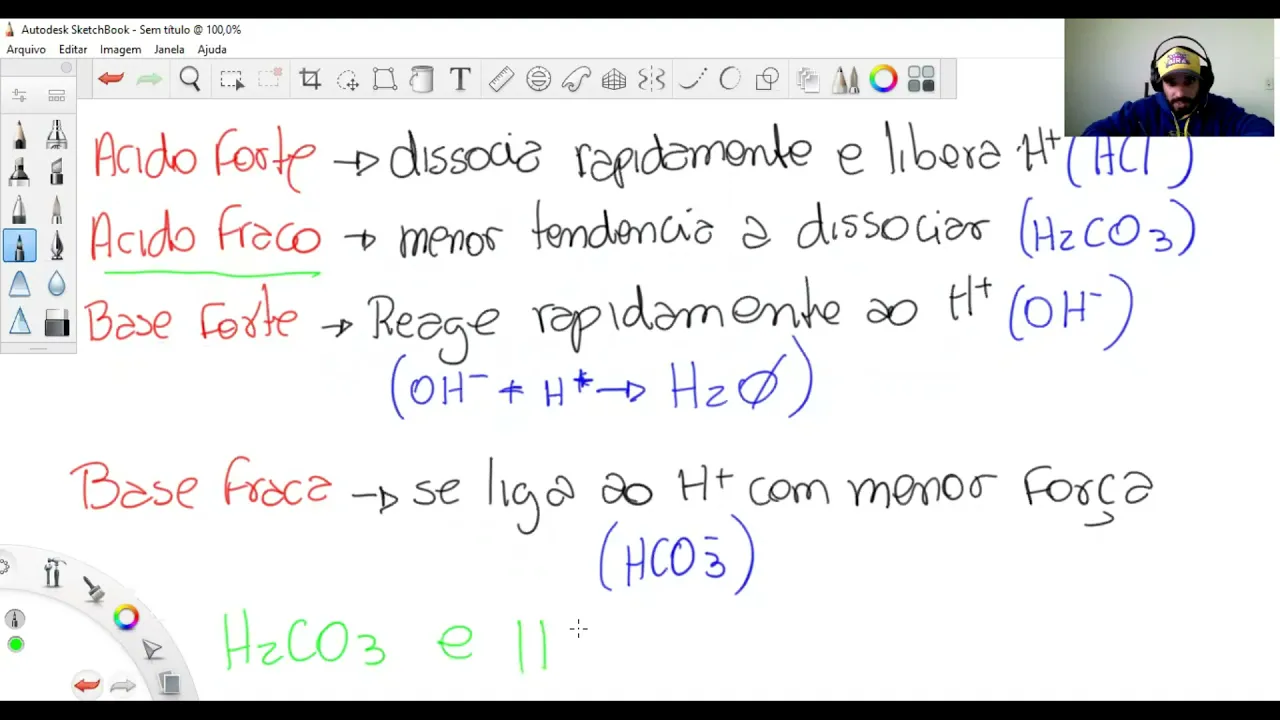 um ácido fraco é bom pessoal que que eu estou me referindo é o contrário né ele tem uma menor tendência a se social de se dissociar bom então o menor a tendência e a dissociar Ah ah mas ele liberte a libera o hidrogênio Mas é bem mais fraca essa essa força de deliberação bom e aí o exemplo que a gente tem é o H2 co3 que é no caso o nosso ácido carbônico Bob Esponja bom e quando a gente fala de base é forte O que que a gente tem aqui quando a gente se refere