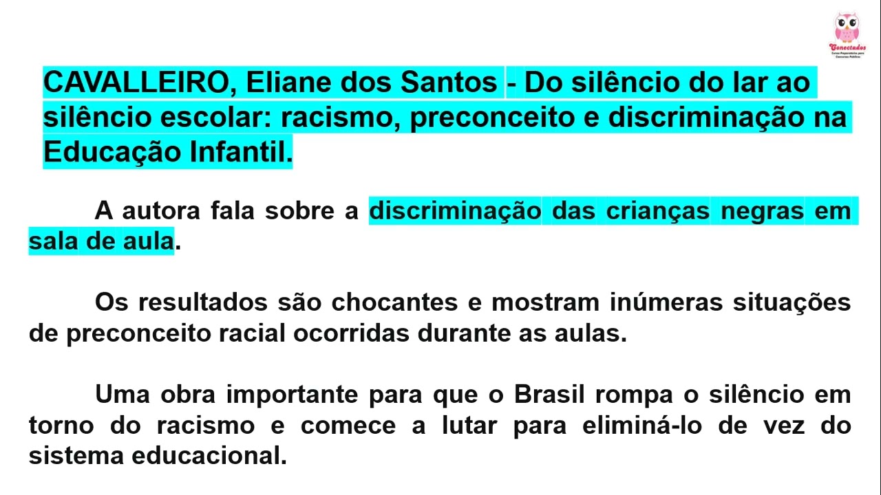 Boa noite a todos vamos a mais autores para para concurso Esses são do infantil Ok vamos lá está sendo gravado essa aula é ao vivo porém está sendo gravado e será enviado separadamente cada autor tá para caso queiram rever a aula Ok vamos lá bom primeira primeira autora que nós vamos estudar Eliane dos Santos Cavalheiro Cavaleiro ela é muito conhecida em concursos públicos o livro do Silêncio do Lar ao silêncio ao silêncio escolar racismo preconceito e discriminação na educação infantil então o que que vem trazendo a autora se vocês já verificarem na capa do livro
