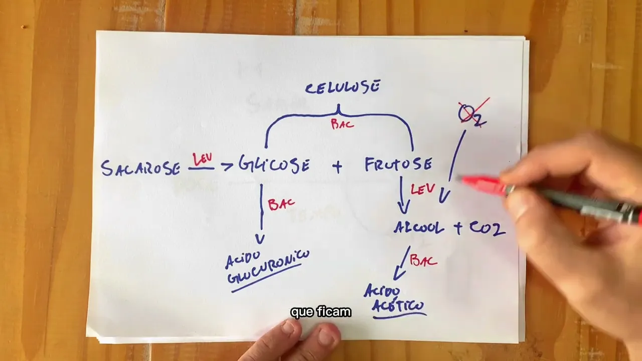 etapa também é onde tem a maior transformação do Sabor onde a bebida começa a doce e vai ganhando acidez à medida que se desenvolve os principais compostos benéficos dessa bebida como os ácidos orgânicos EA formação das demais vitaminas e nutrientes que nós esperamos tô indo mais a fundo vamos entender melhor a via metabólica de transformação que ocorre nessa etapa vamos começar a entendendo que o chá provém os nutrientes da colônia e da bebida e o açúcar que é o alimento da da colônia vai se transformar em ácido então começamos ali com a sacarose que ela