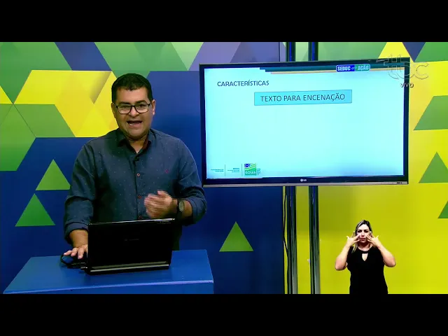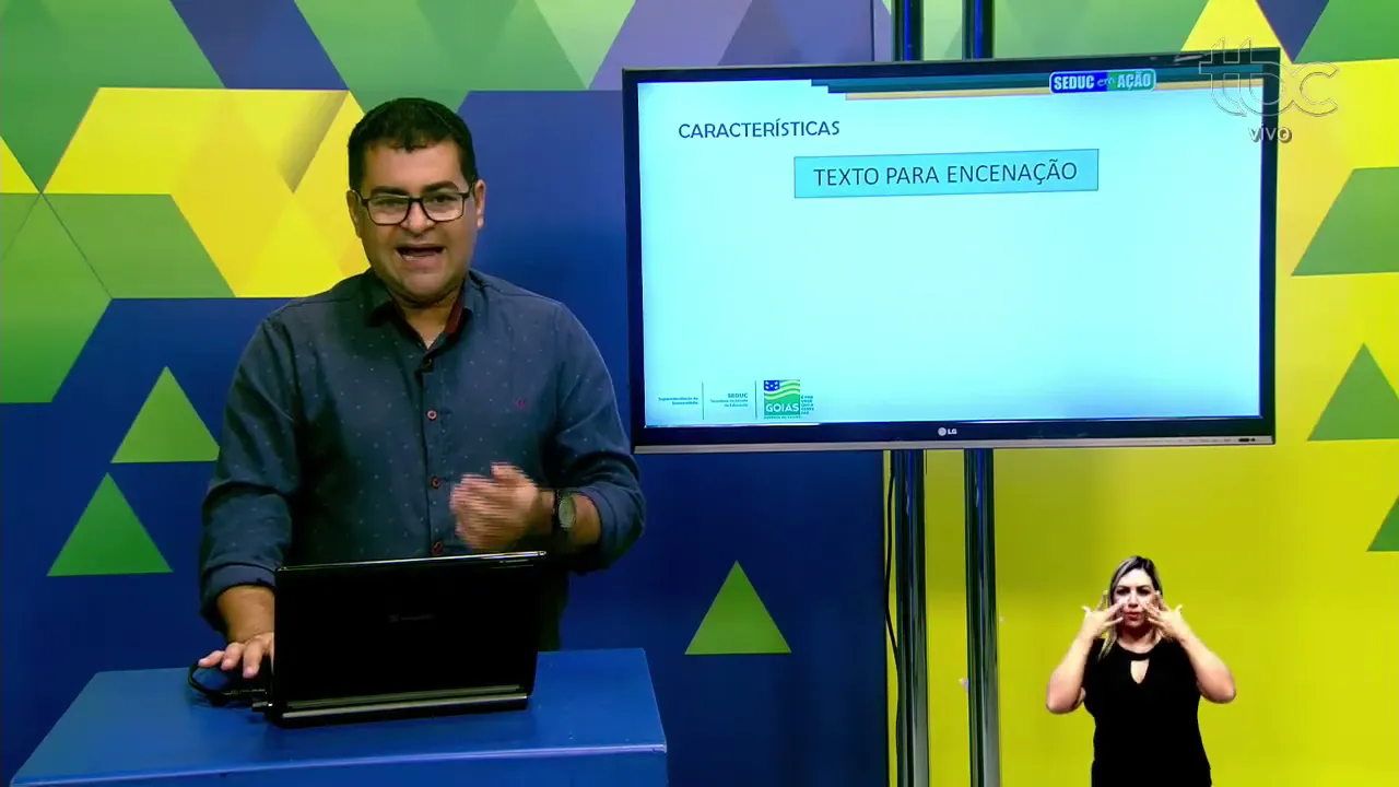 E aí E aí [Música] E aí [Música] o Olá sejam bem-vindos a nossa aula de língua portuguesa para 2ª série do Ensino Médio da rede estadual de Goiás Lembrando que esse é o Projeto cedo criação 2021 Eu sou professor Ivair Alves e a nossa aula de hoje é sobre o teatro conta e o importante para vocês estudantes da 2ª série do Ensino Médio é se anima professora e intérprete em Libras vem conosco hoje falaremos sobre o teatro teatro hoje nós teremos como habilidade né perceber esse gênero textual Então nós vamos ler comparando associando observando forma