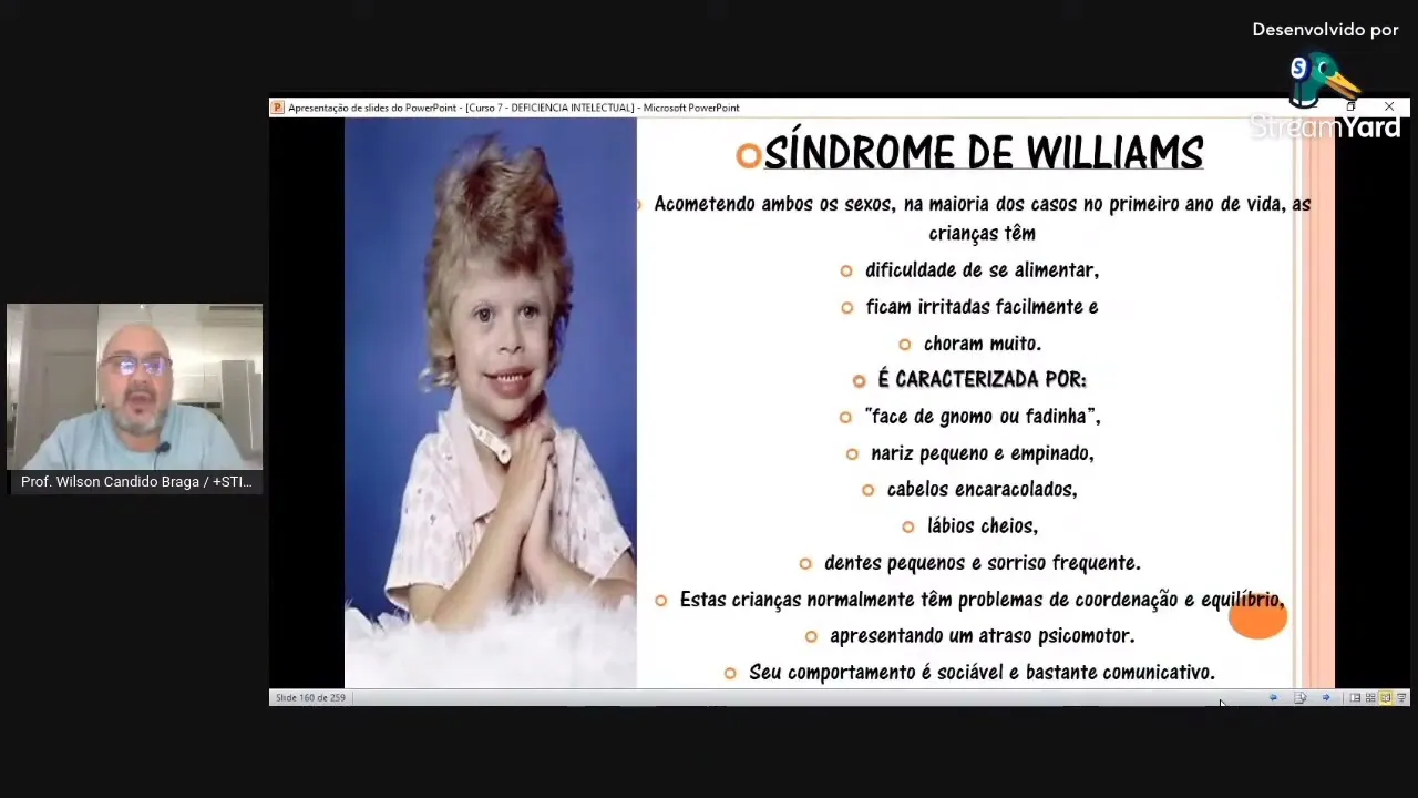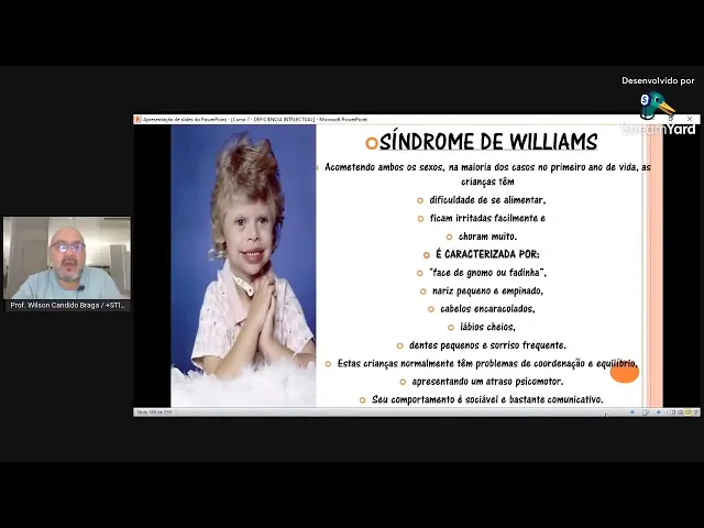 tem umas 50 40 50 síndromes eh descritas mas existem muitas que não se faz uma apresentação em um único material por isso que eu sugeria a vocês que adquirissem aquele livro deficiência intelectual e síndromes infantis para que vocês possam consultar aquele material quando chegar para vocês um quadro diagnóstico desconhecido que vocês ainda não ouviram falar eu vou mandar para vocês o material de hoje com mais outras síndromes mas é importante que vocês Leiam é importante que vocês guardem esse material para consulta e não fiquem contentes apenas com as quatro aulas do curso as quatro aulas