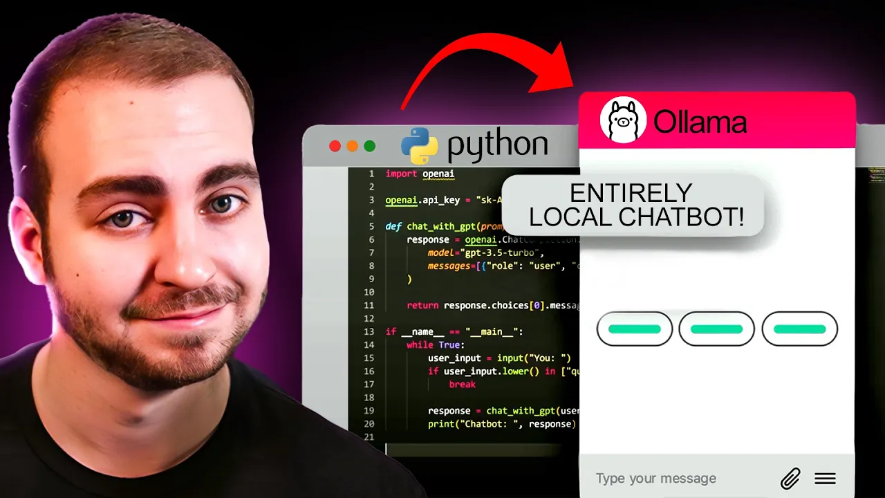 today I'll be showing you how to make a python AI chatbot in just a few minutes and the best part is this chatbot will run locally meaning we don't need to pay for a subscription or connect to something like open AI now the first step here is to download oama so go to ama. com Simply press on download install this application and this is what we'll use to run llms locally on our machine once you've installed o llama the next step is to make sure the installation is working properly to do that you're going to open up a terminal or a command prompt and you're going to type in the following command which is simply olama now this should be working if AMA is running on your computer and assuming this command Works you're ready to move on to the next step now llama is software that allows us to download and run open-source llms I have a list of them on the right hand side of my screen and I'll link this in the description you can see we can access llama 3 with 8 billion parameters 7 billion parameters we have a lot of other models available to us as well now notice that these models vary in size and the larger the model is the more difficult it's going to be to run in terms of the type of Hardware you need on your machine now if you scroll down here you'll see there's some different specifications you should have at least 8 GB of RAM to run the 7 billion parameter models and then 16 to run 13 billion and 32 to run the 33 billion models so make sure that you meet that criteria before pulling these specific models now for our purposes we're just going to use the Llama 3 model with 8 billion parameters and in order to get that on our computer we're going to type the following command this is a llama pull and then the name of the model that we want and this is simply llama 3 when we do that it's going to download this model for us this will take a bit of time depending on how fast your internet connection is and then you'll be ready to use it in my case it's already downloaded so it happened instantly but for you it will take a few minutes to download and then I'll show you how we can test it now that the model is downloaded we can test it out and in order to do that we can simply type amaama run and the name of the model that we want it's worth noting that you can have multiple models here and you can use them by simply specifying their name so I'm going to run llama 3 I'll just go with something like hello world and then you can see that it actually gives us a response if you want to quit this you can type slash bu and then you will exit that prompt so now that we have access to this llm it's time to start using it from python Now using llms like this in Python is actually surprisingly easy and you don't need to be an AI expert in order to work with them however I always find it interesting to learn about how they work at a deeper level and that's where our sponsor brilliant can help brilliant is where you learn by doing with thousands of interactive lessons in math data analysis programming and AI they use a first principles approach meaning you'll get the why behind everything each lesson is interactive and filled with Hands-On problem solving which is six times more effective than just watching lectures the content is created by award-winning teachers researchers and pros from place like MIT Caltech and Google brilliant focuses on improving your critical thinking skills through problem solving not memorizing while you're learning specific topics you're also training your brain to think better learning a bit every day is super important and Brilliant makes that easy their fun bite-sized lessons fit into any schedule helping you gain real knowledge in just minutes a day it's a great alternative to Mindless scrolling Brilliance even has an entire AI Workshop that deep dives into how llms work and teaches you about the importance of training data how to tune in llm and more to try everything brilliant has to offer for free for a full 30 days visit brilliant. org techwithtim or click the link in the description you'll also get 20% off an annual premium subscription now the next step here is to create a virtual environment that will install a few different dependencies in that we need for this project what I've done is open to folder in Visual Studio code and the command I'm going to use now is python 3-m ven V and then I'm going to give this virtual environment a name which is chatbot if you're on Mac or Linux this will be the command if you're on Windows you can change this to Python and this will create an environment for us that we can have some isolated dependencies inside them you can see the chap off folder has now been created and the next step is to activate the virtual environment and then install our packages now if you're on Mac or Linux the command to activate this environment is the following it is simply Source the name of your environment which in this case is chatbot and then bin SL activate if you did this successfully you'll see that the name of your virtual environment will prefix your terminal now if you are on Windows the command can vary depending on the shell that you're using one of the commands that you can attempt is the following back SL venv or in this case it's going to be chatbot the name of your virtual environment SL scripts with a capital slash activate Dot and then this is bat executing this should initialize the virtual environment if you are running in command prompt if you are running in Powershell then you can change this to say PS1 and put a capital on activate so try one of these commands to activate the virtual environment on Windows and again make sure you have that prefix before we move forward now the next step is to install the packages that we need I'm just going to make this a bit smaller so we can read all of them we're going to install the Lang chain module the Lang chain dasama module and the olama module so go ahead and hit enter this will install