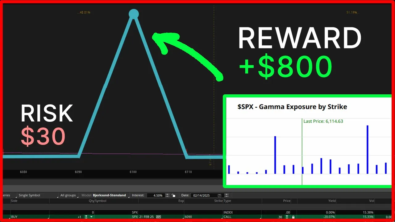 good afternoon everyone in this video we're going to build some SPX trades for monthly expiration pins and we're going to do so by analyzing gamma exposure and dealer flows by the end of this video we'll craft two different trade ideas each one is going to be a lowrisk trade idea one is risking $30 the other is risking $80 and in both cases we're looking to make more than $800 the whole idea of this lowrisk High reward trade is to analyze what is the Market's underlying gamma exposure for this February's monthly expiration and take advantage of