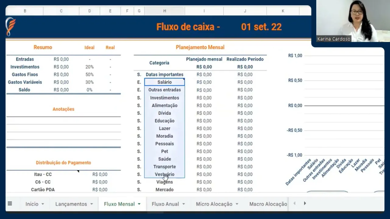 000 então r$ 400 se eu investir 5 500 ali na Previdência é interessante que eu Coupe esses R 900 seja enfim em algum investimento E aí é uma estratégia que você monta com o seu consultor Ah eu tenho de educação mensalidade da faculdade então aqui é interessante que você destine faça ali né a divisão que você precisa para cada uma das suas categorias sempre de olho aqui no saldo para ver se ele tá compatível e se você não tá eh acabando acabar ficando no negativo naquele mês um outro ponto interessante que está serve de análise além da da parte gráfica para ver se você se o seu planejado tá dentro do realizado naquele período é a distribuição de pagamento Então se a gente viu aqui que no Bradesco Você Tem programado de gastos fixos R 500 significa que é importante você ter esse dinheiro na conta do Bradesco para que você não seja surpreendido enfim acabe eh pegando ali algum cheque especial né alguma coisa porque você esqueceu de fazer essa transferência você não deixa os seu dinheiro parado ali né no Bradesco Então você já consegue ter uma visualização muito mais rápida também das faturas do cartão agora falando de alguns errinhos que eles podem eventualmente acontecer aqui você clica em categoria ele aparece né aparece tudo certinho mas aqui embaixo Quando você vai fazer o lançamento direto Pode ser que ele fique carregando tanto aqui na categoria quanto na forma de pagamento isso acontece principalmente quando a gente insere uma nova categoria E aí eu já vou mostrar para vocês aqui como que corrige então aqui em forma de pagamento eu venho em dados validação de dados eu vou procurar aqui o trecho até onde a minha célula ali ela tá selecionada então viu aqui ó na hora que eu passei o mouse ele apareceu aqui esse trecho que é onde tá selecionado eu vou vou vir aqui e vou apagar esses dois últimos números vou concluir quando eu apago ele aparece ele corrige a mesma coisa paraa categoria ficou como carregando eu vou passar um mouse geralmente tá na parte mais embaixo dessa lista então passei aqui ó apareceu o escrito eu apago os dois últimos números se minha fórmula acabar na letra tudo D certo aqui ó já apareceu eu tava at acabei clicando em uma outra categoria Então é assim que a gente corrige essa validação de dados certo e aqui o fluxo anual ele nada mais vai fazer do que multiplicar o seu planejado mensal por 12 e o realizado ele vai fazendo a soma de tudo que você teve naquela categoria eh durante todo o ano certo gente vindo para cá a gente né falei falei que eu ia explicar isso depois chegou a hora vindo aqui a gente tem as datas importantes de Janeiro então aqui ele também já te mostra né de uma forma muito rápido aquilo que você planejou nas suas datas importantes Então você tem que o PVA de Janeiro se a gente mudar para julho tem a viagem do interior que vocês tinham planejado de gastar uns R 1.