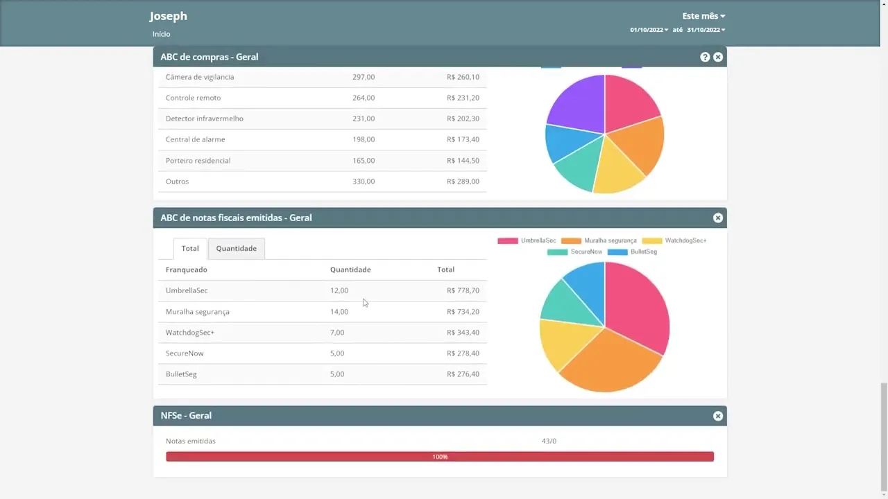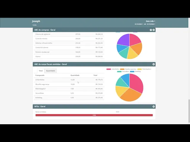 contas e ver como está sendo a venda totalizada da mesma o mesmo pode ser feito com us ou vendedores que estão presentes em todas as contas podendo assim verificar o Real rendimento de cada um dos seus usuários não menos importante Podemos verificar a parte fiscal sabendo quantas notas e qual o valor total emitido em cada uma das contas esta ferramenta também permite a visualização de relatórios de produto e relatórios de financeiro consolidado e comparativo Vale lembrar que assim como os relatórios do gestor as informações não podem ser editadas por aqui sendo necessário o acesso manual