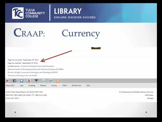 Here are some examples of where to look for "Currency" on a webpage. this is the Center for Disease Control and Prevention. As you can see I have it circled over here on this part of the page when this material was last updated.