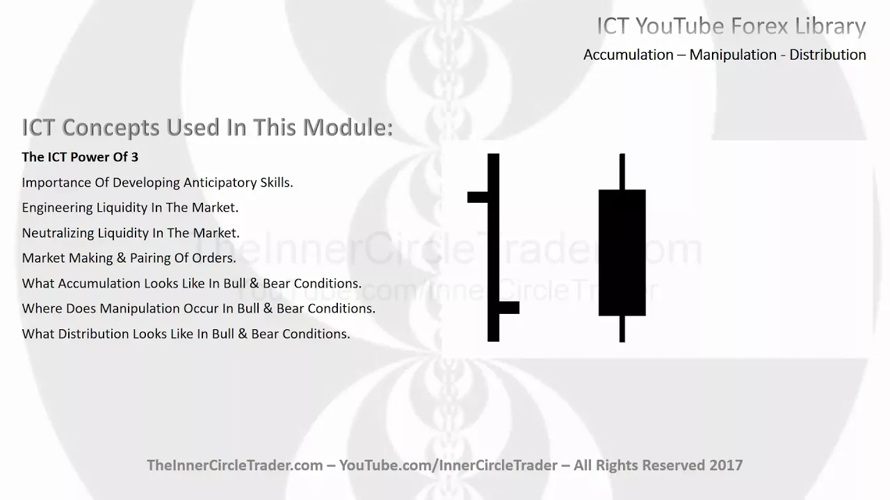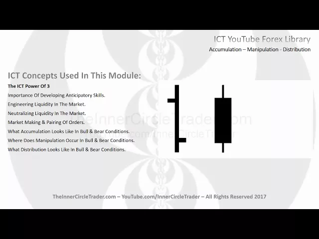 okay folks welcome back okay this teaching is going to be specifically dealing with accumulation manipulation and distribution okay the ICT concepts used in this module the ICT power of three importance of developing anticipatory price skills engineering liquidity in the market neutralizing liquidity in the market market making and pairing of orders what accumulation looks like in bull and bear conditions where does manipulation occur in bull and bear conditions what distribution looks like in bull and bear conditions all right so we're looking at a crude depiction of a open high low close bar and for the purposes