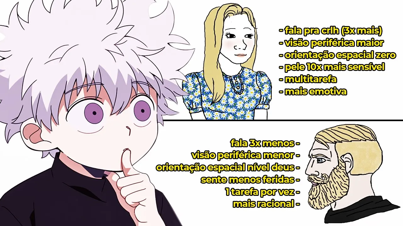 homens e mulheres evoluíram de modos diferentes porque tinha que ser assim os homens caçavam as mulheres ficavam com o grupo Os Homens protegiam e as mulheres cuidavam como resultado seu corpos e cérebros tomaram rumos diversos no processo da evolução e se transformaram para se adaptarem melhor as suas funções específicas os homens se tornaram mais altos e mais fortes que a maioria das mulheres e seus cérebros se desenvolveram para cumprir as tarefas que lhe cabiam já as mulheres ficavam satisfeitas de ver seus homens saírem para trabalhar enquanto elas mantiam um fogo aceso na inverno seus cérebros também evoluíram para atender as funções que precisavam desempenhar por milhões de anos as estruturas dos cérebros dos homens e das Mulheres foram se formando de maneiras diferentes hoje em dia sabemos que mulheres e homens processam as informações de modos diferentes pensam de formas distintas tem crenças percepções prioridades e comportamentos diversos desconhecer esse fato é uma receita certa de confusão sofrimento e desilusão para toda a vida para quem não me conhece prazer meu nome é Logan e para quem já conhece T hoje com mais um vídeo e dessa vez e eu vou te apresentar algumas diferenças entre o sexo masculino e o sexo feminino atitudes maneiras de agir pensar diferenças físicas tenho certeza que você vai gostar bastante do vídeo porque ele vai te explicar Muitas das coisas que acontecem no nosso dia a dia vai te revelar muita coisa que você não sabia e também vai te ensinar muito sobre o sexo oposto ou seja como lidar com as nossas diferenças Antes de eu começar a citá-las eu preciso dizer que tudo que eu forou apresentar para vocês está baseado em diversas pesquisa de renomados paleontólogos etnólogos psicólogos biólogos e neurocientistas não é baseado só em achismo em sim em evidências e estudos científicos Ah e é claro para algumas coisas que eu forou apresentar aqui algumas pessoas podem dizer eu não sou assim eu não faço isso é claro que há muitas exceções mas eu tô falando aqui sobre a média Ou seja a média significa que se você entrar numa sala cheia de gente você vai anotar que as mulheres são mais baixas do que os homens é claro que vai ter uma mina mais alta que um homem lá minha namorada é bem maior que eu mas em geral na média os homens são maiores que as mulheres entendeu Então bora lá primeira diferença é a mulher um radar a mulher percebe claramente quando a outra pessoa Tá aborrecida ou magoada o homem tem mais dificuldade de perceber isso as mulheres possuem uma habilidade sensorial muito mais aguçada que o dos homens Pois para garantir a sobrevivência da família as guardiães da cria precisavam estar alertas paraos pequenas mudanças no comportamento da sua prol poderiam indicar dor fome doença agressividade ou tristeza os homens cumpriram sua função de caçadores de comida e eu tô falando lá nos primórdios eles não ficavam por perto tempo suficiente para aprender a interpretar os sinais não verbais ou as formas de comunicação interpessoal isso é muito louco mano Uma pesquisa realizada na universidade de pennsylvania mostrou que o cérebro de um homem quando tá em repouso a sua atividade elétrica é interrompida em pelo menos 70% enquanto no cérebro feminino a atividade elétrica fica 90% ativa ainda uma outra diferença entre nós é diferença de visão sim enxergamos de formas diferentes como Caçador o homem precisava ser capaz de identificar e perseguir alvos distantes Ele desenvolveu então um tipo de visão que parece ser uma visão de túnel para que não se desvie do foco a mulher precisava de um raio de visão que lhe permitisse perceber algum Predador se aproximando por conta disso durante a evolução da nossa Espécie a mulher desenvolveu uma visão periférica mais Ampla enquanto os homens uma visão mais de túnel o exemplo disso hoje em dia é que as mulheres conseguem ver tudo que tá dentro da geladeira do armário sem ao menos mexer a cabeça enquanto a gente homem procura um objeto dentro desses lugares virando a cabeça para lá para cá para cima e para baixo e é por isso que nossas mães mulher mes conseguem achar as coisas com bem mais facilidade que a gente por isso que parece que nossas mães são bruxas consegue achar um negócio que a gente estava procurando no lugar que a gente já procurou e não tinha achado e estendendo nesse papo de visão Aqui vai um dado muito interessante o campo visual mais amplo é a causa das mulheres raramente serem surpreendidas observando um homem e pelo contrário é difícil encontrar um homem que nunca tenha sido acusado de devorar com os olhos alguma menina pesquisas na área sexual realizadas em vários países concluíram que as mulheres observam os corpos masculinos tanto quanto os homens observam os delas e talvez até mais só que como sua visão periférica é superior raramente são flagradas fazendo isso seguindo ainda nesse papo de visão enquanto a mulher enxerga melhor no escuro que o homem os olhos masculinos são mais eficientes quando se trata de um campo visão mais longo e mais estreito o que lhes dá uma superior e portanto mais segura visão noturna a longa distância essa capacidade combinada com a sua boa orientação espacial ainda vou falar sobre isso mais paraa frente permite ao homem identificar o movimento dos outros veículos na estada Tanto à frente quantra Tais com maior facilidade a maior parte das mulheres que dirigem relatam uma espécie de cegueira noturna não consegue distinguir em que ponto da estrada estão os carros que se aproximam o que os olhos de Caçador tipicamente masculinos fazem com mais facilidade Resumindo galera numa viagem longa deixa sua mina dirigindo durante o dia e quando ficar de noite você assume o controle é mais seguro fazer uma viagem assim agora uma diferença auditiva as mulheres escutam melhor que a gente principalmente são os Agudos as mulheres po
