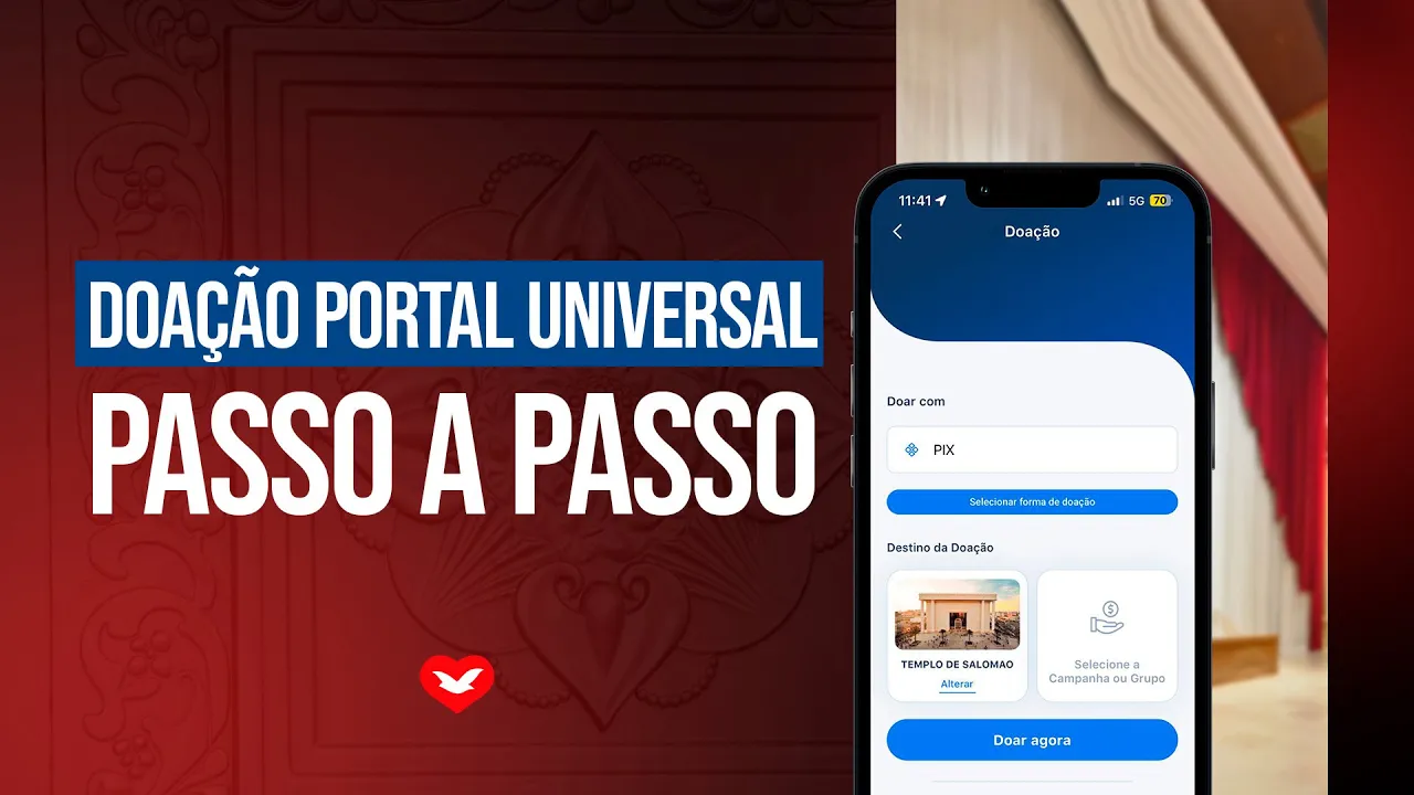 você sabia que é muito simples e seguro fazer as suas doações pelo aplicativo Portal Universal veja o passo a passo Abra o aplicativo Portal Universal no seu celular no menu inferior clique em doação agora na tela de doação é simples e fácil selecione o valor que você quer doar depois selecione a forma que pode ser cartão de crédito boleto bancário ou pic nesse exemplo vamos escolher a forma de doação via PX após isso selecione o destino começando pela [Música] igreja em seguida selecione a campanha ou o grupo para o qual quer doar [Música] do confirmação