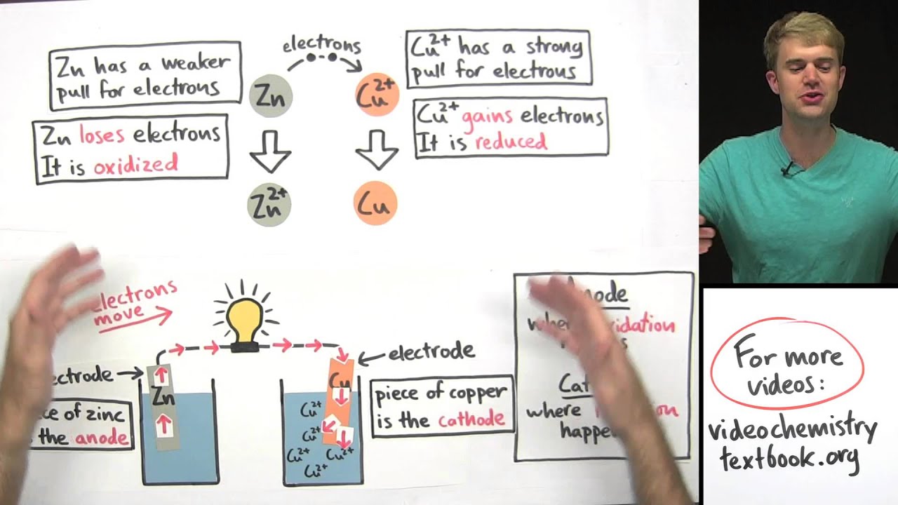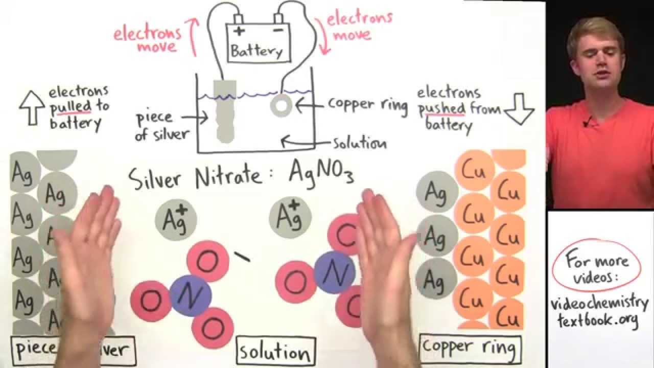 how these electrodes here are connected to the battery okay this electrode here is hooked up to the negative side of the battery so electrons as you can see here are moving out of the negative side and they're being pushed into this electrode so that means that this is the cathode it's the site of reduction over here this electode is hooked up to the positive side of the battery so electrons are moving out of it that means that oxidation is going to be taking place it's going to be pulling electrons from things and this is what