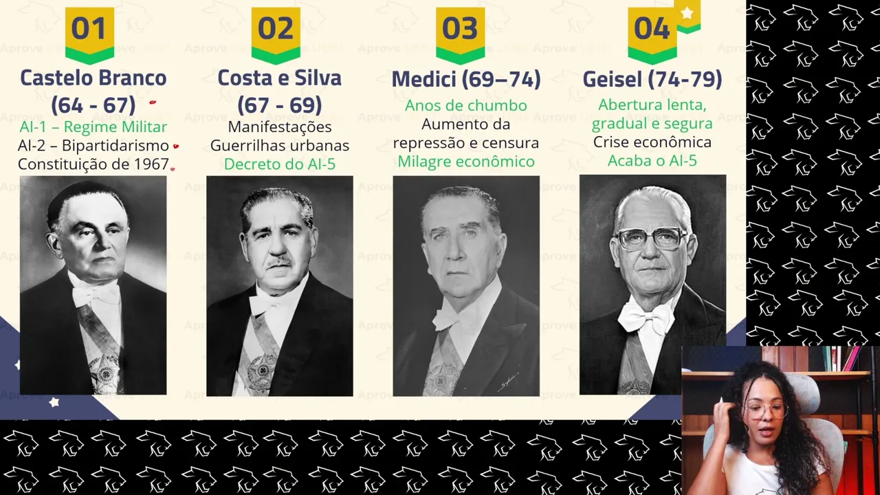 o que você precisa saber sobre ditadura militar no Brasil para ir bem nas suas provas vestibular ditadura militar é um período da história do Brasil mais recente né ele começa ali em 64 vai até o 85 então é um período mais recente e um período que traz muito Impacto social muitas questões eh de preocupações políticas que a gente tem que ter com esse período Então as provas de vestibular Principalmente as provas que tem caráter mais crítico que tem caráter de problematizar mais as questões trabalham muito com esse período questões dos Direitos Humanos questões econômicas e