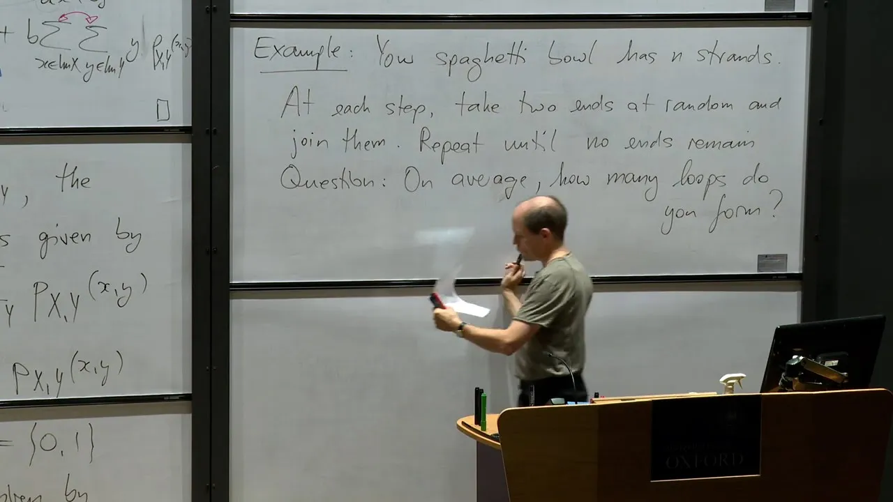 out of your bowl suppose the bowl has n strands pick two ends and tie them together there's two possibilities either they are the ends of the same strand in which case you form a loop or they are the ends of different strands in which case you just get a longer strand of of spaghetti Okay now what's the question here I'm asking on average how many Loops are you going to form if you keep doing this until you have no more ends in the bow right so that's um something let me just write that down and