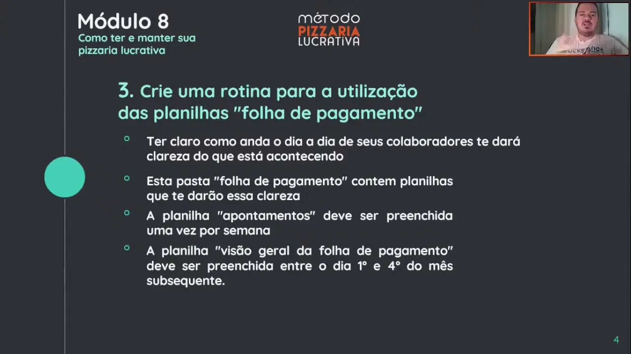 [Música] três criar uma rotina para utilização das planilhas de folha de pagamento folha de pagamento muito dos erros da de empresas é ter uma folha de pagamento que tá acima do que deveria é ter uma folha de pagamento que que fica suprimindo os seus lucros ou onerando demais o o custo da sua pizza folha vocês vão perceber que ela é uma das coisas que mais depois dos insumos é o que mais representa no seu custo da da sua pizzaria Então você tem que ter cuidado no início para quem tá começando e não tem funcionário colaboradores