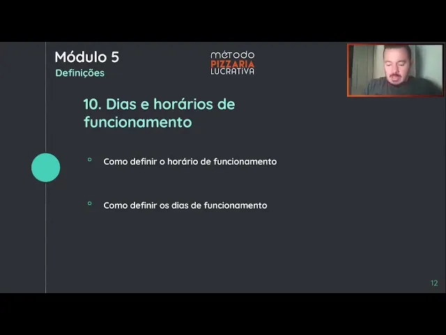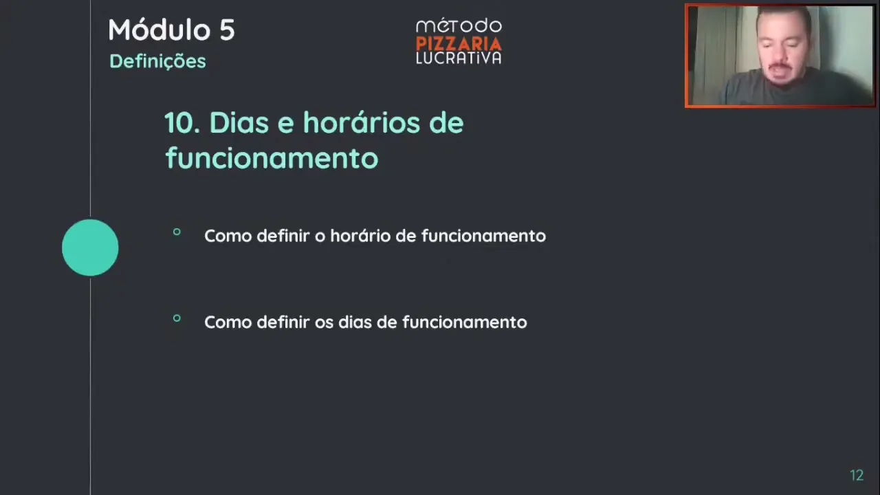 hora a mais do nosso tempo pelo volume de venda Então como é que você define se na sua cidade o pessoal tá acostumado comprar Pit 17 horas se seus concorrentes abrem 5 horas você abra também 5 horas e testa se o pessoal tá acostumado 17 18 horas abra 18 ah todo mundo abre 18 mas eu quero testar antes da 17 sempre faça teste horário de encerramento se vai ser 11 horas que eu acho cedo pra pizzaria Mas depende muito do que você vende de 11 horas até é meia-noite 1 hora você pode ter horário diferenciado