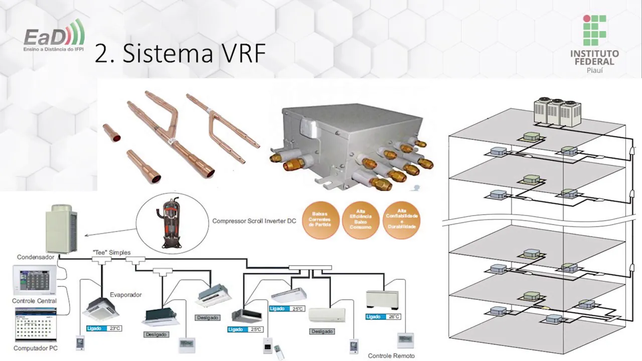 de baixa renda onde líquido antes de sucção de gás essas duas populações vão percorrer aí o edifício alimentando várias unidades internas então é esse tipo de sistema ele vai permitir um controle independente de cada ambiente então eu posso ter uma unidade interna de um quarto funcionando atendendo a carga térmica de 12 mil btus e eu posso ter uma outra unidade interna em um outro quarto no quarto do lado por exemplo atendendo uma carga de 12 18 mil btus então ele vai fazer um controle independente é de fornecimento de fluido refrigerante pra cada unidade interna de