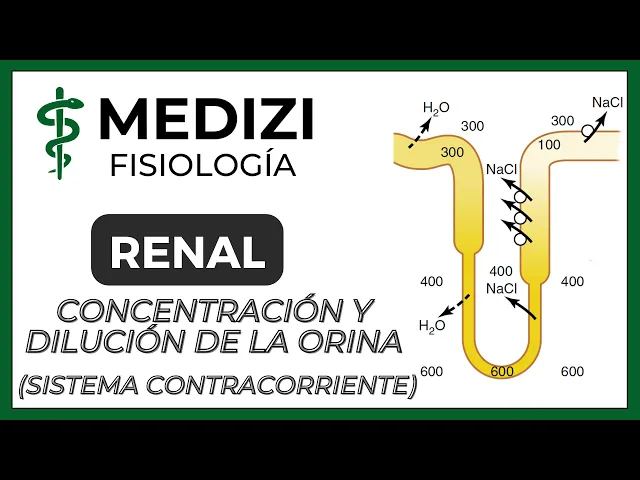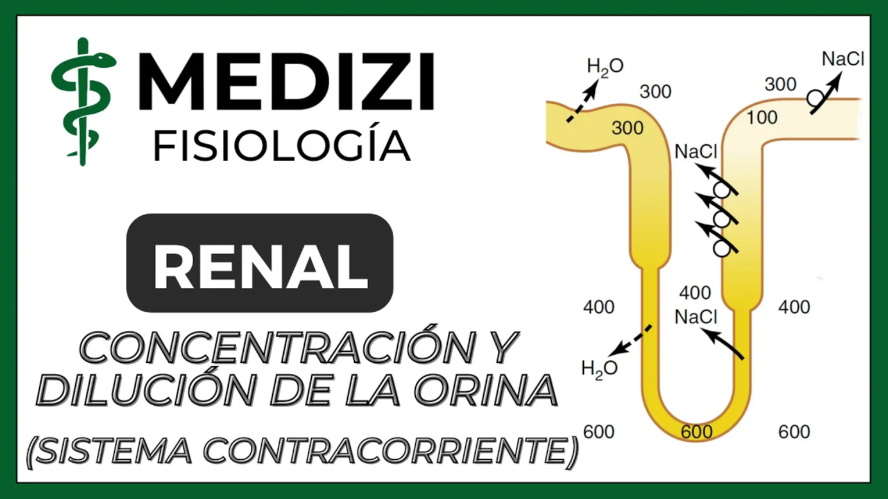 [Música] sí hola cómo están bienvenidos a la clase de fisiología renal en el canal medicine mi nombre es eduardo paiva y vamos a hablar de la concentración y dilución de orina y del sistema contracorriente tópicos que vamos en esta clase a la mujer algunas generalidades vamos a hablar del gradiente osmótico corte como dólar en donde hablaremos de la multiplicación por contracorriente del reciclaje de urea y de los vasos restos en el intercambio por contracorriente también hablaremos de la producción de orina hiperosmolar o sea de una orina concentrada y de la producción de la orina y polvo la losa una orina diluida este es uno de los temas más complejos de fisiología renal y es importante que conozcamos bien la anatomía funcional renal y las diferentes partes de la cne from que lo vimos en anteriores clases recordando que existen dos tipos de neuronas las corticales y las neuronas yoox tan medulares son estas zonas y otras medulares que tienen alta capacidad para concentrar la orina y aquí tenemos un riñón con su corteza no corteza renal médula renal para pila renal aquí para pila renal donde desemboca no es esa el filtrado y vamos a darle un zoom y el primer detalle importante aquí que tenemos que tener en cuenta para entender el mecanismo de contracorriente renal es que la dirección de la dirección del flujo tubular representado con flechas negras fíjense hasta segmento descendente hasta decirle ascendente este flujo tubular es contrario al flujo de las falsas rectas o sea de los capilares de representado con flechas blancas este detalle nos va a hacer entender muchas cosas así que ténganlo en cuenta ya que lo veremos más adelante los términos hiperosmolar y postular son fundamentales para entender la concentración y dilución de orina la osmolaridad del plasma es aproximadamente 300. 000 moles por litro y la corregía de 282 estas modalidades da en su mayoría por el cloruro de sodio aunque también tiene aporte en la glucosa y la urea la olla es importantísima en la seguridad regional otro detalle importante que lo veremos más adelante cuando hablemos en esta clase de una sustancia y post molar y sos molar o hiperosmolar nos referimos a una diferencia de solaridad respecto al plasma y post molar y post motico hipotónico es lo mismo así que si ven que dice y popular es lo mismo equipo tónico oip osmótico cuando un líquido comienza a perder o disminuir la osmolaridad decimos que ese líquido se está diluyendo y a un líquido que comienza a ganar los moles o aumentar sus modalidades decimos que ese líquido se está concentrando esa es la base para entender este sistema este mecanismo de contracorriente y muchas otras cosas más hay que tenemos dos personas una con falta de agua y otra con exceso de agua en ambos casos el cuerpo se adapta para poder sobrevivir la persona que tiene falta de agua como le falta agua los solutos en sus plazas comienzan a concentrarse aumenta la modalidad plasmática y este aumento del área de plasmática es detectado por los unos receptores en el hipotálamo aumentando la liberación de hormona antidiurética aa dh también llamado vasopresina esta leche aumenta la reabsorción de agua en nuestro cuerpo y la orina seguirá concentrado mira al tener una orina hiperosmolar entonces en respuesta a la falta de agua nuestro cuerpo disminuye el volumen de orina y esta orina será una orina hiperosmolar ahora en la persona con exceso de agua pasará lo contrario la disminución de las modalidad plasmáticas disminuye la secreción de dh por ende habrá una menor resolución agua hacia la sangre y en consecuencia mayor excreción de orina o sea el volumen urinario es elevado pero la osmolaridad urinaria disminuye tenemos entonces una orina diluida una orina y post volar por efectos diluyentes del agua nuestro cuerpo puede generar una orina tan concentrada que puede llegar a 1. 200 a 1.