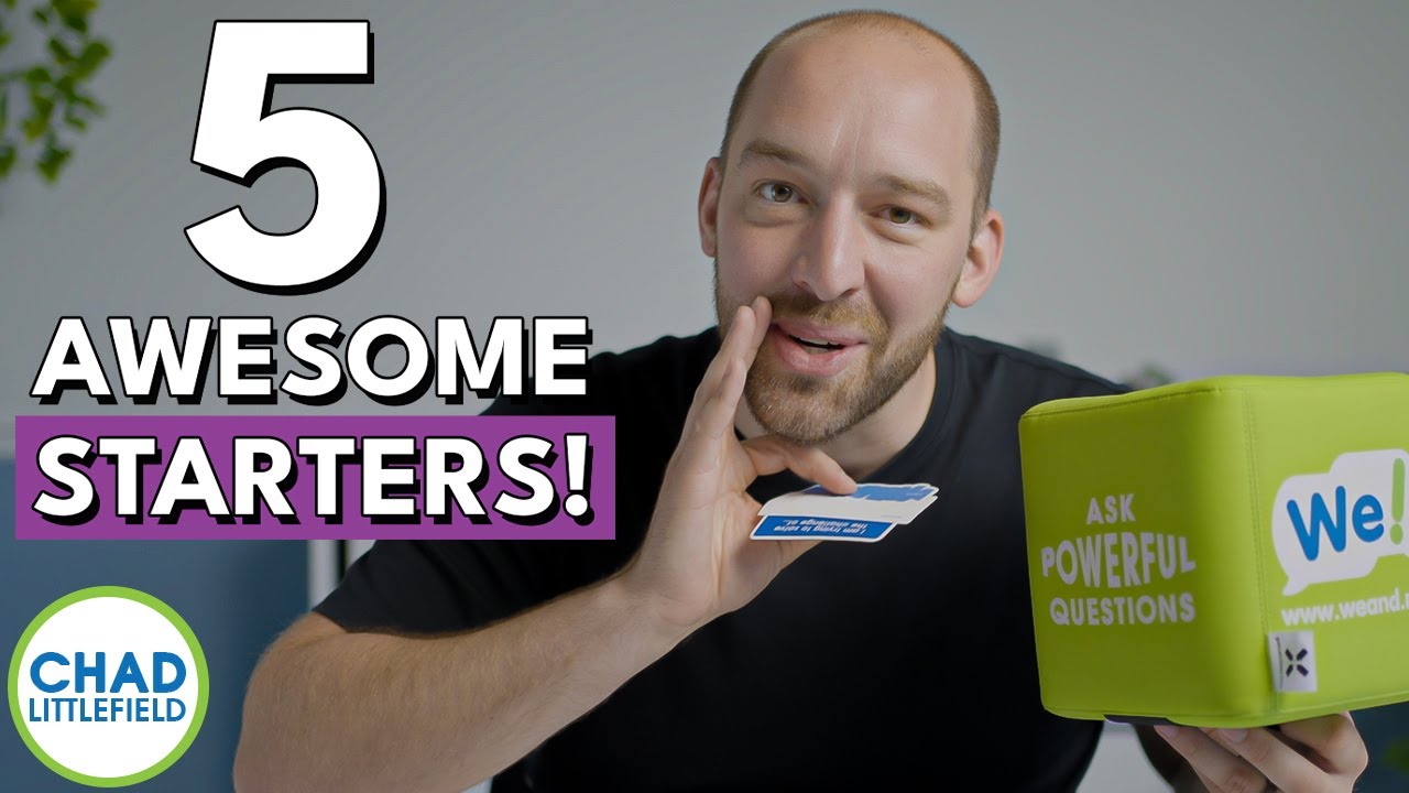 so we're going to play a little bit of conversation roulette conversation roulette so there are 20 of each color cards in this deck so uh I'm going to take only the green cards which are questions that are fun and light and I'm going to split them in half I'm going to put 10 on this stool I'm going to put 10 on this school and in a minute I'm going to um invite you guys to divide yourselves into two equal groups and circle around the stool all right and so the purpose of what we're about to