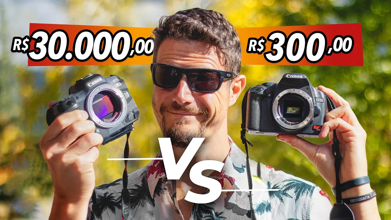 hoje eu vou pegar essa câmera aqui ó de mais de R 30. 000 E essa outra 100 vezes mais barata literalmente trezentão e vou tentar fazer a exata mesma foto nesse lugar aqui para que depois a gente pegue e olhe bem de perto né as fotos para ver se a diferença prática nelas é tão chocante quanto essa aqui no valor curtiu a ideia maravilha vamos em frente então editor roda vinheta e simbora Fala aí beleza Ricardo poço aqui bem-vindo bem-vinda de volta ao meu canal se você ama fotografia esta aqui é a sua casa Então siga esse canal para você ficar por dentro de tudo ok então vamos lá ó Hoje eu vou colocar a minha poderosa Canon r5 com a lente 24 A 105 MM um equipamento aqui profissional top de linha para fotografar lado a lado com esse outro aqui um pouco pouco mais Modesto né a Canon t1i lançada em 2009 e a lente aqui de 18 a55 para que você aí veja a diferença final aqui na qualidade das fotos em situações diferentes e tire as suas próprias conclusões vamos lá então a kenon R5 continua hoje em dia né com o mesmo valor aproximado aqui de r$ 3. 000 direto aqui na loja da Canon e vai depender né do kit que você montar porque o valor pode subir muito como você tá vendo aí E claro que você pode achar valores bem diferentes pesquisando em lugares diferentes também isso aqui é só uma referência né já a Canon t1i não está mais à venda nova na loja oficial da Canon nem em lugar nenhum provavelmente e eu paguei exatamente 80 canadenses alguns dias atrás em uma loja de usados aqui no Canadá o que daria uns R 300 aí convertendo ou seja 100 vezes menos do que que os r$ 3.