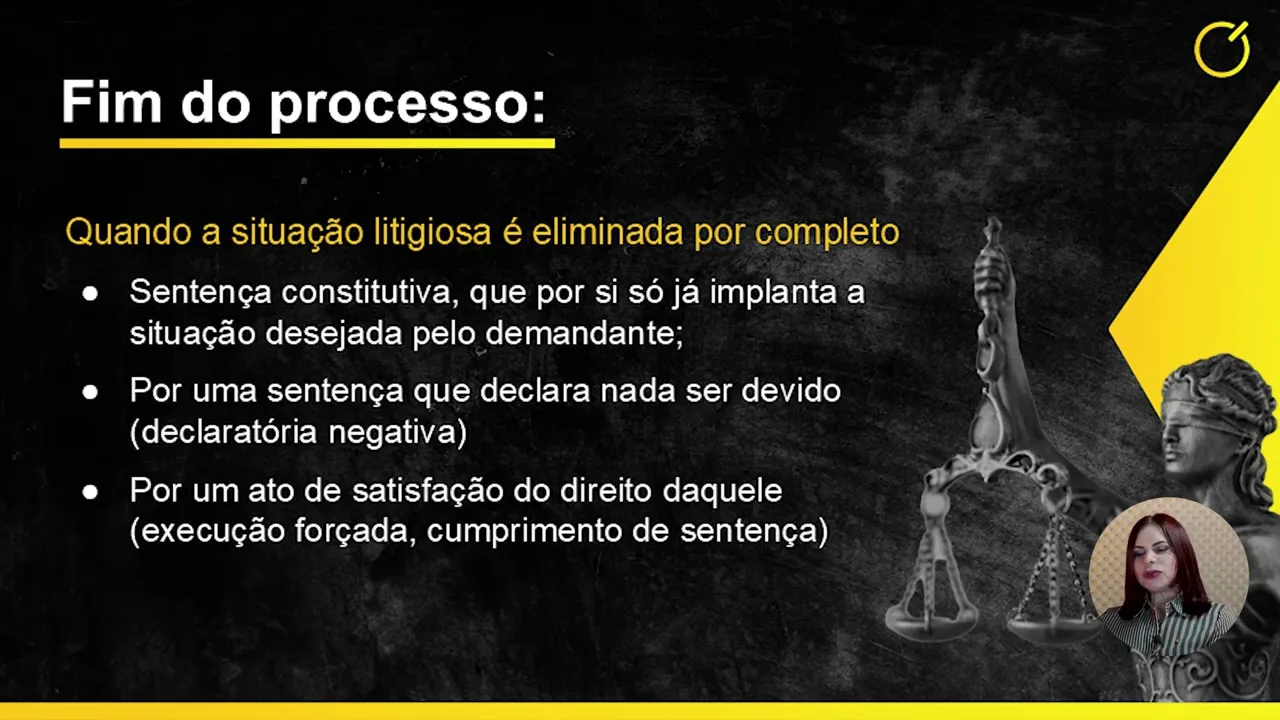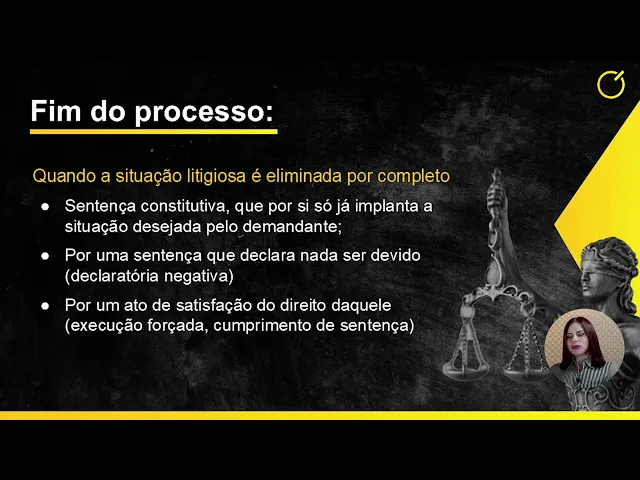 Já o fim do processo ocorre quando a situação litigiosa é eliminada por completo. Então, existe uma sentença constitutiva que, por si só, já implanta a situação. Desejada pelo demandante, o demandante queria uma guarda.