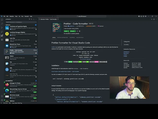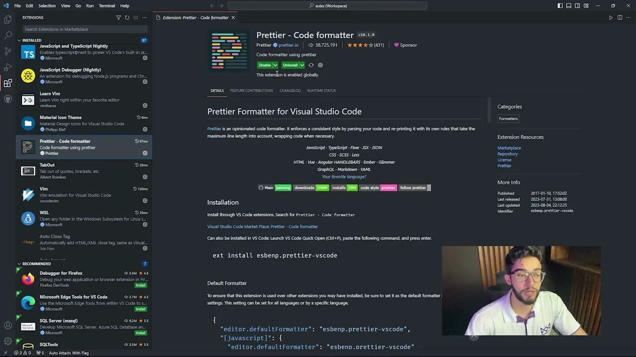 pelo prer o que que é esse prer ele vai formatar o nosso código então se a gente digitar um código com espamento errado com identação errada com algumas coisas estranhas o prer vai nos ajudar e vai formatar pra gente então para evitar bagunça né Agora que você agora que você tá iniciando aí a programação o prer vai te ajudar muito e temos também o Code Runner né que como o nome já fala ele executa o código que a gente tá trabalhando então ele vai facilitar também pra gente testar o que que a gente tá desenvolvendo