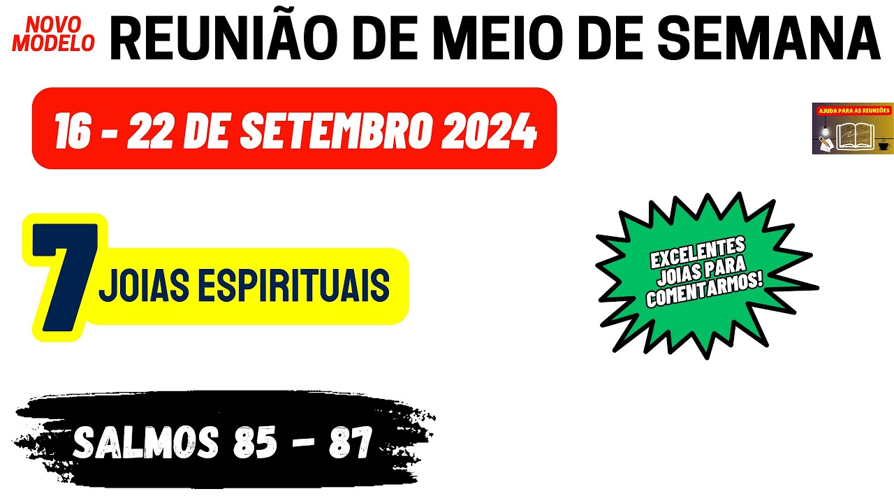 sejam bem-vindos ao nosso canal ajuda para as reuniões Neste vídeo Vamos Fazer Uma Breve análise e preparação da reunião nossa vida e Ministério Cristão completa desta semana 16 a 22 de setembro de maneira objetiva vamos analisar as partes principais desta reunião que são aquelas por perguntas e respostas onde podemos dar nossos valiosos comentários iniciando vamos preparar algumas joias espirituais que podemos encontrar na leitura dos Salmos 85 a 87 esse texto é a base de toda a reunião passando para a sessão nossa vida cristã nós vamos preparar os dois discursos um de 5 minutos e o