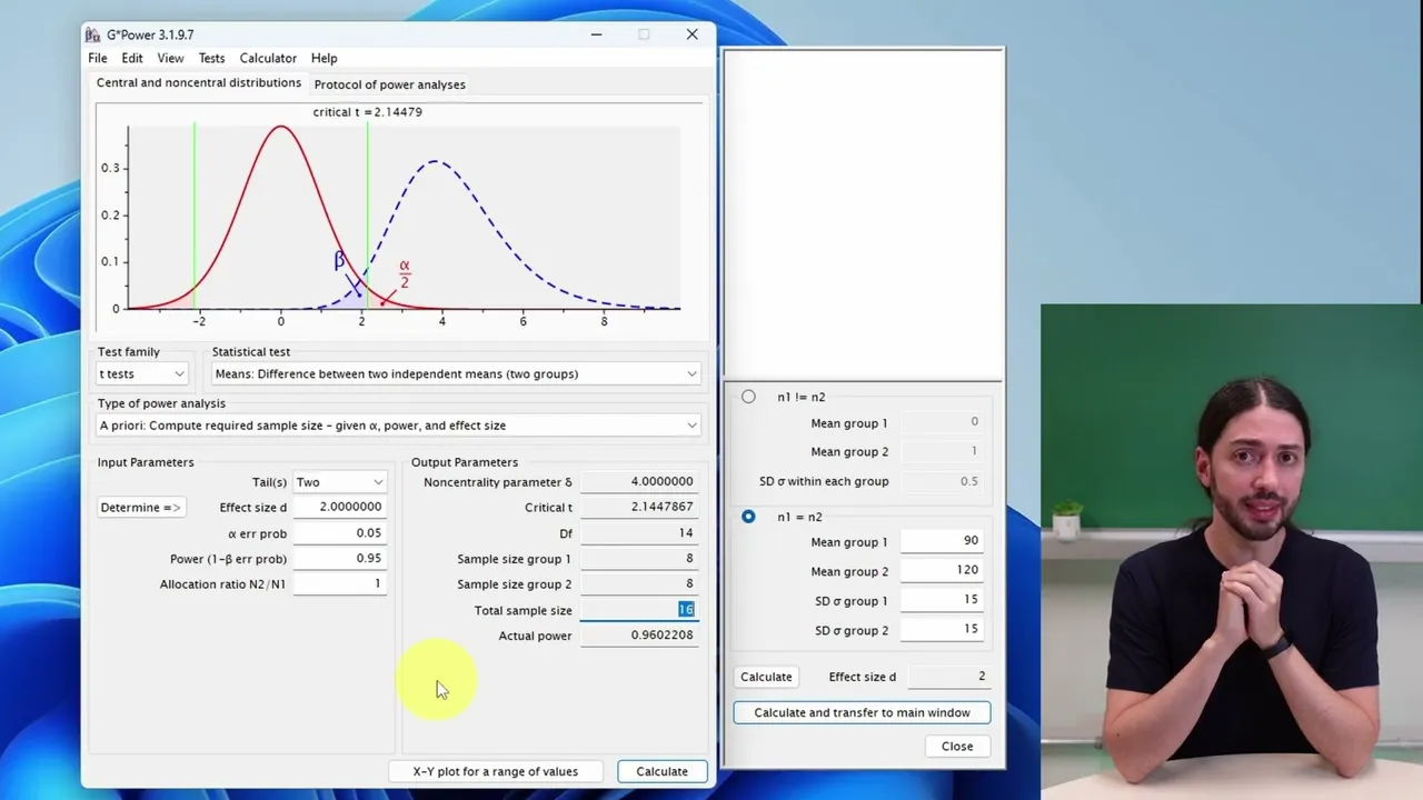 como que a gente vai chegar nesse dia aqui existe uma fórmula de calcular para calcular ele manualmente Mas a gente pode determinar aqui então Digamos que os nossos NS sejam iguais entre os grupos e a gente quer ver um efeito por exemplo de glicemia 90 no controle e eu quero ver apenas um leve aumento de glicemia 120 num grupo experimental com um desvio padrão de 30 talvez é claro né esse desvio Talvez para um grupo controle esteja um pouco alto coloquei esses valores arbitrários aqui peço para calcular isso dá um tamanho de efeito 1 na