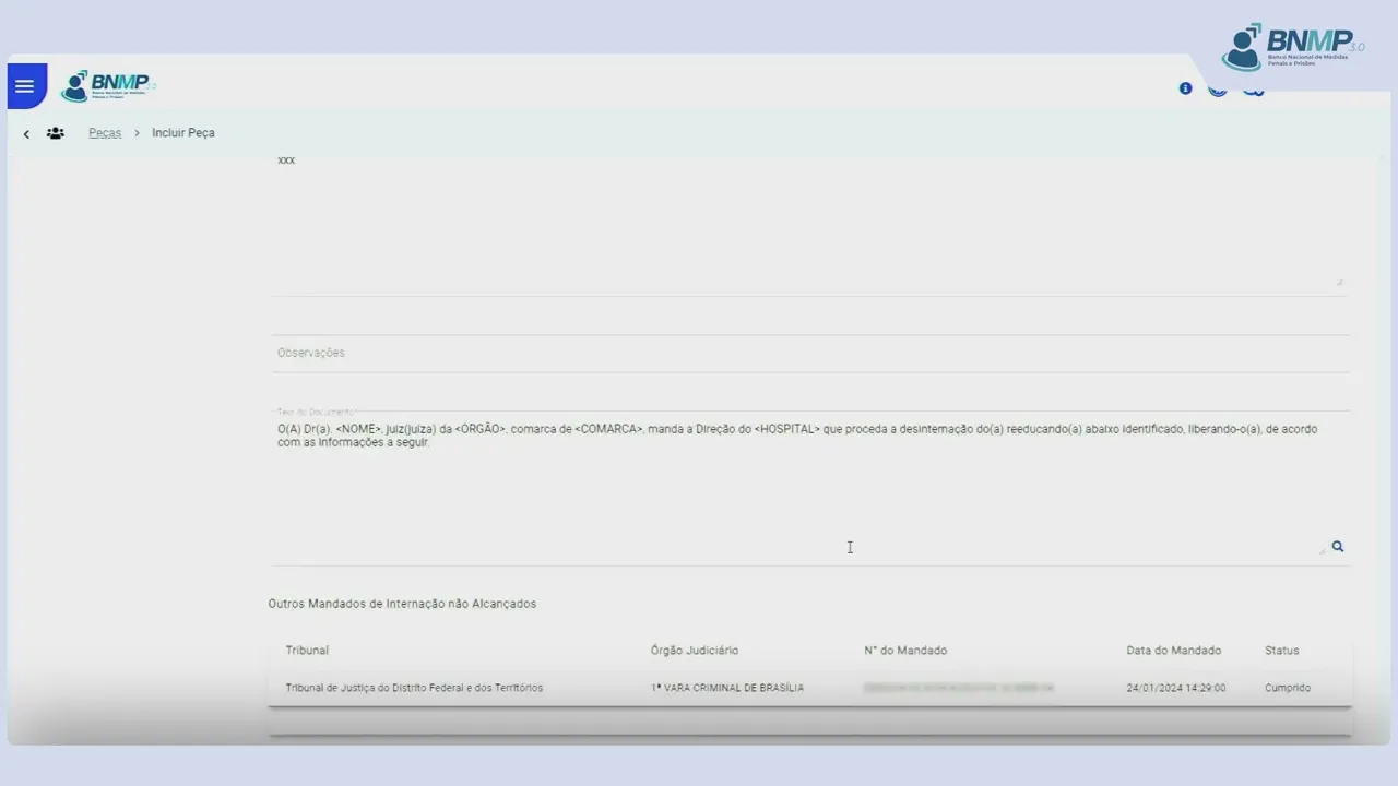 [Música] Como cadastrar a peça ordem de desinternação atenção para lançamento desta pea é necessáo o cadastro prévio do mandado de internação para localizar o cadastro da pessoa em pessoas cadastradas Clique na opção ver todas no campo pesquisar digite o nome da pessoa ou outro dado conhecido e Clique na lupa identificada a pessoa clique no menu localizado no canto direito da tela e selecione a opção incluir peça em dados da peça selecione ordem de desinternação selecione o número do mandado a que se refere a ordem de desinternação Digite o número do processo selecione o motivo da
