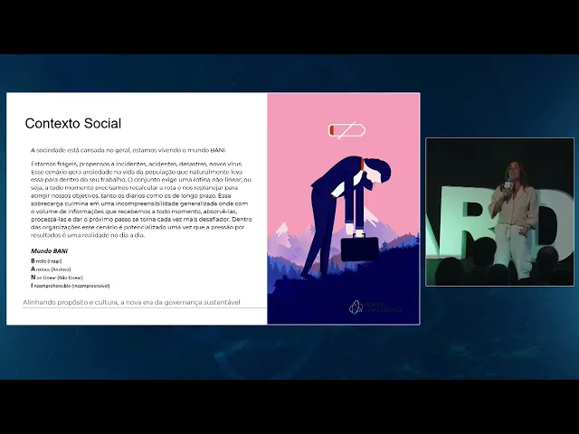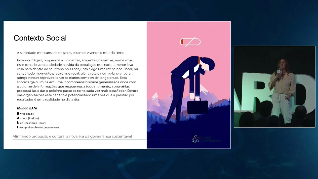 eu quero com vocês então com uma salva de palmas receber ela que vai trazer esse tema pra gente cultura propósito sustentabilidade nas empresas Messias vem para cá Boa tarde tão me ouvindo bem Bora eu vou no desafio aqui desse microfone porque ele falou que eu tenho que segurá-lo o tempo todo eu tô mais habituada no microfone Madona Mas vamos lá um prazer imenso estar com vocês nós vamos bater um papo hoje como ele já falou mudar um pouquinho o o lado do cérebro a gente tava exercitando aqui eh bastante sobre inteligência artificial falando de modelos matemáticos eh a gente viajou com o Walter também falando sobre education né Falando de marketing Educação de convergência de mercados e hoje agora nós vamos bater um papo sobre o que a gente precisa no ambiente para que tudo isso aconteça né então o convite é a gente falar sobre o alinhamento aonde o propósito a cultura e a sustentabilidade se encontram pra gente ter prosperidade no ambiente organizacional então um pouquinho sobre mim quem ainda não me conhece eh um prazer est com essa audiência tão qualificada eu tenho o privilégio e a responsabilidade de representar o Senior board do capitalismo consciente no Brasil já é o terceiro ano que eu faço parte do grupo eu tenho uma carreira aí de mais de 25 anos na área de tecnologia fiquei 19 anos na Microsoft passei por um por um período internacional lá também e nos últimos 10 anos eu venho me dedicando ao ecossistema de startups então mais recentemente como cocio da humanizadas e eu vou trazer dados da humanizadas eh eles pesquisam bastante sobre inteligência artificial na área de investimento e na área de comportamento e vocês vão ver um pouquinho mais sobre isso fui se do zen Club por do anos durante o período da pandemia e a gente pesquisou muito muito sobre saúde mental e a gente vai bater um papo passando um pouco por bem-estar também e estive como sócia E também ainda agora da blip né da steing que foi a primeira empresa de inteligência artificial no país que tinha o português PTBR aqui não sei se todos conhecem mas também na área de marketing e agora também me dedico ao conselho de empresas o o junto aqui que é o cocio da catalista catalista é uma delas que eu represento redação online o grupo anga e a Talent Academy e como O Thiago falou sou um investidora do Bossa e da BR angs então eh a ideia Hoje é a gente não voltar no que o o Walter fez aí um trabalho incrível já introduzindo o tema eu sei que o tema não é novo para Nenhum de Nós aqui colegas conselheiros por outro lado a gente quer trazer o propósito pros centro e como um destino né a gente vai brincar um pouquinho como ele falou de modelos matemáticos eu gosto de eh pensar no Waze quando a gente entra para dirigir a primeira coisa que eu coloco é para onde eu quero ir né Que Que destino eu quero atingir e a empresa na sua grande maioria ela nasce porque o seu fundador pesquisou um problema esteve de frente com um desafio que ele queria resolver tem uma paixão por um tema reúne um grupo de pessoas e depois começa a contratação mas existe um propósito não sei o quanto de vocês já leram mas tem um livro muito interessante que é o dilema dos fundadores né E ele fala sobre isso que 70% do das empresas fundadas elas nascem com o empreendedor lidando com o desafio pensando por eu vou eh empreender o que que eu preciso resolver no mundo né e e ele ainda diz que há uma sobreposição mas 60% dos fundadores eles entram nessa na área de empreendedorismo eh não necessariamente pel propósito de resolver alguma coisa mas pelo propósito de autonomia de poder de escolher com quem trabalha e de independência e curiosamente e não é eu acho que não é curiosidade né mas o melhor resultado acontece nos fundadores que são missionários que T como propósito o seu destino o seu nestar então Eh eu vou passar um pouquinho por contexto até para para que contextualizar né Por que que isso é importante hoje né a gente tá falando de tantas mudanças de um ambiente tecnológic amente mais avançado que a gente já viveu e muitas informações o volume de dados gerados como nunca antes vivemos mas a gente tá vivendo também como Walter trouxe momento de grandes pressões econômicas no contexto econômico as duas guerras pressionam ainda mais o que já tá frágil a gente vai com certeza no Brasil a gente tá vendo situações de desafios a Europa e os Estados Unidos América do Norte enfrentando pelas primeiras vezes conversas mais difíceis Então esse é um cenário que adiciona pressão ao ambiente que todos nós já trabalhamos e também no contexto ambiental muito recentemente aí no no Brasil a gente viu o que o que ocorreu no Rio Grande do Sul e que é uma realidade as mudanças climáticas e o impacto que tudo isso tem nas pessoas né E por que que eu trago essas duas variáveis de pressão porque elas vão pro nosso ambiente de trabalho elas vão pros ceos presidentes de conselho que estão conosco para para nós mesmos e pros nossos colegas conselheiros e também pra equipe executiva das empresas que a gente tá aconselhando né E isso eh talvez eh possa de alguma forma ajudar a gente a enfrentar o desafio que o Walter trouxe né Será que eu nu gerando um crescimento eh muito grande será que o correto é continuar pressionando a organização por um crescimento sempre muito acentuado ou será que eu preciso entender o contexto que eu tô operando e perceber se alguma coisa tem que ser diferente né então a gente precisa começar a refletir sobre essas questões e é por isso que eu tô trazendo esse início aqui da nossa conversa para orientar o papo e adicional ente como se não bastasse a gente fala muito de crise energética e definitivamente os dados comprovam a gente tem uma grande crise de energia humana né o ser humano tá cansado a equipe tá cansada o que eu mais escuto é ccia eu não consigo motivar o meu time Meu time tá ca