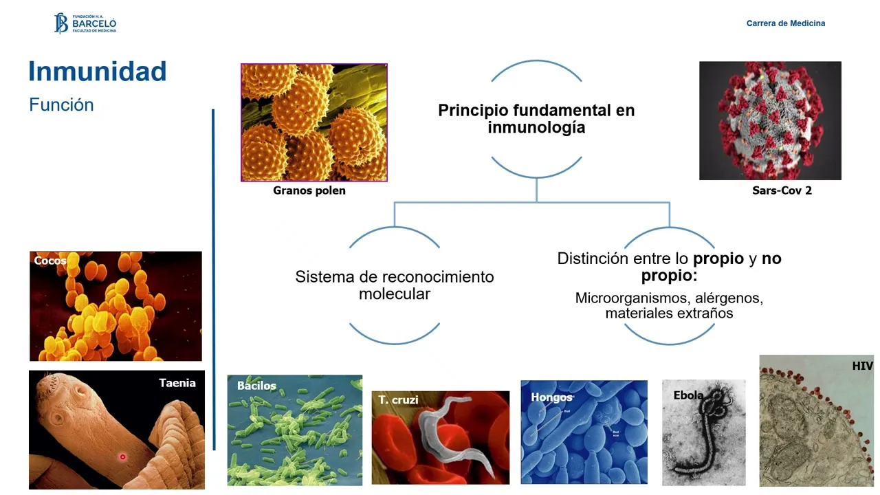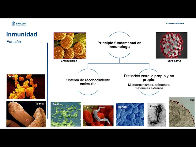 sí Por lo tanto entonces tengamos esta clase como una presentación a la materia para ir viendo cada uno de los actores del sistema inmune y que después vayamos entendiendo a lo largo de los meses que nos quedan Cuál Es el papel de cada uno de ellos En la respuesta inmune por lo tanto lo que vamos a ver ahora es un pantallazo de muchos temas pero de manera superficial para después ir clase a clase ahondando un poco más por supuesto hay muchos temas nuevos hay mucha mucho muchos términos nuevos que son distintos a los que estamos