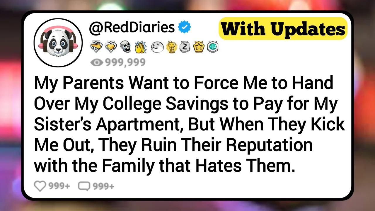 my parents want to force me to hand over my college savings to pay for my sister's apartment but when they kick me out they ruin their reputation with the family that hates them my family has been going through a difficult Financial time recently and I considering the situation got a job so I could afford my college education but their expectations are completely unrealistic last week they told me I had to use my college savings to help my sister because she was about to move into a new place but was short on money for context my