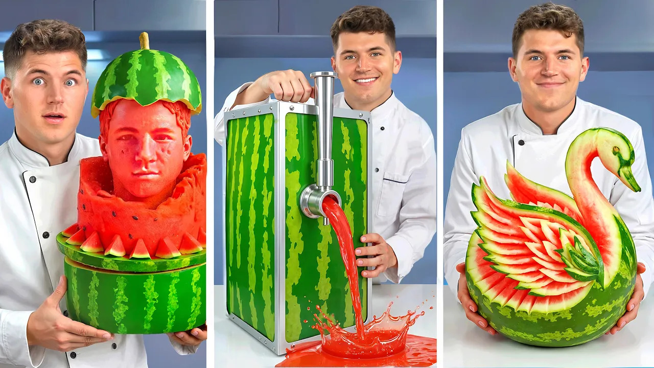 more creative. These are watermelon carvings and as you can see, this is me. And this is Gordon. Does it look like me? Patrick: Yeah, it looks like you. And the detail on it is nuts. And also, why are you bigger than Gordon Ramsay? Doesn't he have more subscribers than you? Nick: That's the problem. Currently, as you can see, my watermelon carving is larger than Gordon's here. But that's not how it is on YouTube. As you can see by this carving here, he is very happy. And that's because he's ahead of us in subscribers. But if