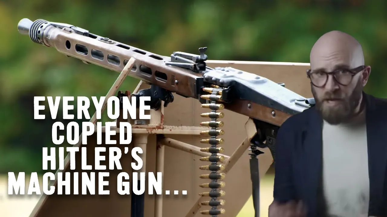 fire wiped them out the Russians ran to their places the string of cartridges slid through our hands with brutal rapidity while the noise of the gun burst against our eard drums the mg-42 was shuddering and jumping on its legs and shaking the veteran who kept trying to steady himself its percussive bark put a final touch on the vast din which broken out through the vibrations and smoke we were able to observe the horrible impact of our projectiles on the Lost mass of red solders in the trench in front of us the mg42 took a horrible toll that quote penned by Guy Moro veteran of the gr tchin division in his Memoir the Forgotten Soldier perfectly encapsulates the abject horror that the subject of today's video the mg42 wrot introduced in 1942 and the name it was a German machine gun that put more than double the amount of lead downrange as its Allied counterparts so fast did it fire in fact that the Americans took to calling it buzs saw simply due to the fact that when the trigger was depressed its brutal rapidity sounded more akin to a power tool than any kind of machine gun that they'd ever heard don't believe us we'll have a listen to this hear what we mean it fires so fast that you can't even distinguish between the individual rounds in your ear and if that just happens to have peaked your interest then boy do we have a treat for you because in the next 20 or so minutes we're going to fully dissect the mg4 42 in all of its terrifying Splendor so let's begin shall We The mg42 Story begins with the mg8 Germany's go-to machine gun during World War I which was introduced all the way back in 1908 compared to the later mg42 however it was a very different Beast with it being all about laying down slow and steady barges of fire which had achieved by having a nice and middling rate of fire of 500ish round per minutes which made sure its Barrel didn't get too hot as well as through the incorporation of a water cooling system literally a big shroud filled with water around a barrel which could be emptied and refilled during firing which have done fast enough ensured that the barrel would never over heat this was all well and good make no mistake the mg8 which continued to see service right the way through to 1945 as both a fortress gun and among second line units was certainly a mean bit of kit but it wasn't perfect chiefly its downsides came from one thing and one thing alone its weight as with all of its supplementary gobbins its tripod a full water Jack into an optic of some kind it could happily be pushing 40 kilos which when World War I had shown that Modern Warfare was all about Mobility was certainly not ideal as even the most absolute of units would struggle to quickly Chu one over their shoulder and Scar a double quick like when the Tactical situation called for it postwar addressing these shortcomings led to the development of the mg13 in 1930 a far lighter machine gun that weighed in at a mere 13 kg easily light enough for a single soldier to operate and maneuver as for how they achieved such radical weight savings water cooling was dropped in favor of just an air cooled barrel and make up for that in quite a clever move it has to be said it was also fitted with a mechanism that allowed for quick Barrel changes during combat to facilitate sustained firing further to that the heavy tripod was also dropped in favor of a simple little bipod that clipped onto the end of the barrel and for a stock it was fitted with a light little padded tube that could be folded away just to make it that little bit handier on the Move particularly if one wished to Rambo it as a final touch it also dropped belt feeding which had been used on the mg8 in favor of magazine feeding which both allowed for quicker reloads and kept the rounds nice and compact so that the machine gun was easier to maneuver on the battlefield there can be no doubt about it the mg13 had ticked every single box that it had been asked to and it was indeed a nice light super portable machine gun it had its issues however because it had gone too far the other way and it was in fact so focused on portability and maneuverability that it was a tad useless in the sustained fire roll the lack of tripod for instance meant that it couldn't really be firmly anchored down to keep it steady when giving it the beans from a defensive position and it being magazine fed meant that despite the clever trick with the Quick Change Barrel it simply couldn't lay down a heavy barrage of fire effectively as them having a m 25 round capacity coupled with the 600ish rounds per minute fire rate of the gun and meant that you had 2. 5 seconds of fire till it was empty and you had to stop what you were doing and stick another one in as compared to a belt-fed machine gun where if you knew you were going to be laying down heavy lead you could simply join belts together and squeeze the trigger to your heart's content what they really needed was a Do-it all machine gun one that could operate in both the light and heavy rolls effectively and that's exactly what they got for 4 years after the mg13 with the introduction of the mg34 it was belt fed and had a quick change Barrel so could happily keep up sustained rate of fire it had a supplementary lefet tripod which could be carried separately to spread its weight arounds and give it a nice stable platform for firing from a defensive position it also had a high rate of fire 900 is rounds per minute which certainly gave it an edge when laying down suppressive fire and the cherry on top it did all of this while actually being lighter than the mg13 weighing 12 kg instead of 13 in fact it struck the middle ground between light and heavy machine gun so well that its basic design of belt fed and air cooled with a quick change Barrel spawned a whole new classification of machine gun in Modern military lingo general purpose machine gun or gpmg with everything from the FN mag M60 PK and type 67 all essentially being The mg34 Descen