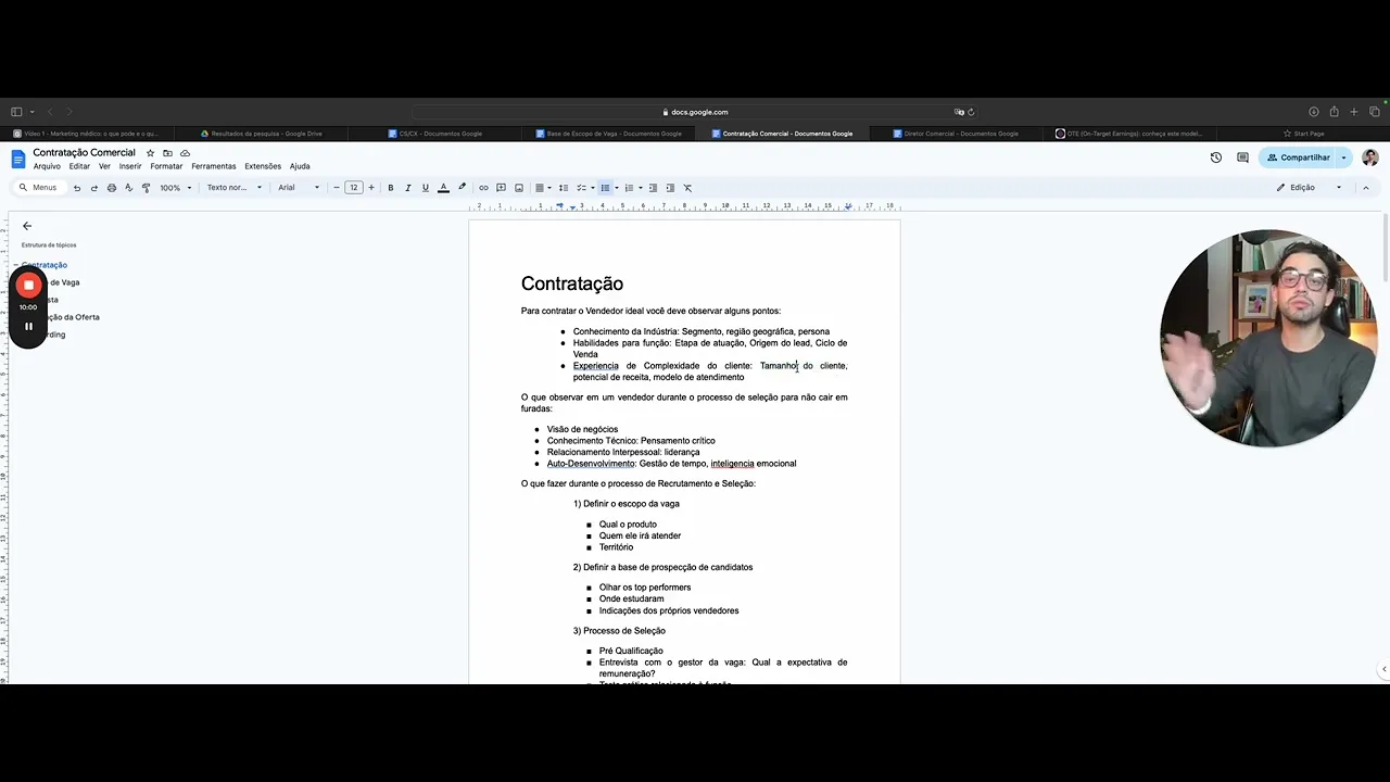 sejam muito bem-vindos e bem-vindas de volta às nossas aulas de vendas e hoje eu quero falar com vocês sobre contratação de equipe comercial esse aqui é um tópico super importante eu sei que poucos de vocês Talvez tenham experiência com isso então e a minha ideia aqui é passar um olhar mais técnico de como nós fazemos o nosso processo de contratação já acertamos mas antes disso erramos bastante e eu quero passar para vocês alguns toques né de coisas que nós erramos e que eu espero que vocês não errem também então assim para você contratar um vendedor e quando eu falo vendedor eu tô falando de SDR bdr ldr para que você que não sabe eu acho que até importante a gente fazer esse alinhamento aqui então falando de equipe de vendas nós vamos dividir basicamente em três grupos nós teremos os prospectores nós teremos os vendedores ou fechadores e nós teremos os gestores de carteira tá dentro dos prospectores Nós temos ldr o ldr é quem faz listas de potenciais clientes para o seu negócio então é quem faz a lista para code Call quem alenca todos os leaders que você vai entrar em contato no Instagram é uma pessoa que faz lista uma pessoa profissional barato nós aqui na B2 não temos ldr é profissional barato para que você ppe tempo dos profissionais mais caros que são bdr e SD bdr principalmente porque quem faz prospecção Ativa é o bdr para que você tenha um profissional que faz a parte chata mais barata e a pessoa que faz a parte mais importante ele tá livre só para bater telefone depois do ldr vem o bdr o bdr e usdr eles divergem porque o bdr ele faz prospecção ativa code Call e entra em contato frio pelo Instagram fica fazendo social selling isso é bdr SDR vai fazer a recepção dos leads que estão chegando do Funil então SDR é inbound bdr é outbound Tá certo depois que nós passamos por esses pré-vendedor né e o ideal é que esses pré-vendedor eles entreguem entre 80 e 90% de reuniões qualificadas para o closer que são os chamados SQL né Sales qualified Lead Pedro Por que você não quer mandar 100% porque se eu mando 100% e eu faço um filtro Muito grande qual é a tendência que eu jogue SQL fora porque eu quero que ele me entregue tanto Lead qualificado que às vezes ele pega um que ele tá em dúvida mas que é qualificado ele joga fora então quando você tem ali 80 90% você garante que 100% dos SQL vão entrar né ou quase 100% do SQL vão entrar e que você vai ter uma leve quantidade ali de Lead desqualificado para que esse closer também não fique sem fazer nada né muitas vezes ele vai ter a cidade então é bom que ele Pegue um ou outro ali para ele também ficar só na bola redonda preciso que ele corra atrás também ok passando desses profissionais nós teremos os closers E aí o Close ele pode ser inside Sales Ou seja aquele que tá dentro do negócio né que faz a venda dentro do negócio que é o que nós fazemos né a gente tem uma chamada de Meet e nós temos o Field Sales Field Sales é quem sai a Campo vai bater no consultório em consultório para tentar arrumar cliente acredito que no caso de vocês assim como no nosso isso não seja aplicável então nós estos aqui é inside Sales certo o cliente vem até nós e nós fazemos a venda dentro da empresa depois disso nós temos os gestores de carteira no gestores de carteira vão entrar Claro os account managers né que aqui na B2 nós colocamos isso dentro da função de CS então a função de CS na B2 e assim deve ser na sua empresa também ela não é uma função apenas de relacionamento ela uma função de venda eu quero que esse meu CS esteja de olho nesse cliente para identificar a pontos que ele pode precisar de outros serviços para que a gente venda outros serviços para o mesmo cliente ou até mesmo a gente identifique se esse cliente não pode ser um bom indicador e ele pega esses leads e joga de novo aqui no funil passa pro S SDR para o SDR ou bdr fazer a prospecção desse bdde Tá certo então é assim que funciona dentro da B2 todos esses profissionais São vendedores todos eles ou vendedoras todos e aí o que é que nós precisamos observar na hora que a gente vai contratar esse profissional eu preciso que ele tenha um conhecimento da indústria o segmento por exemplo no nosso caso quando a gente fori contratar SDR ela já tinha trabalhado vendendo coisas médicas para governo né ela fazia b2d né que é bem comum então assim sabendo que ela vendia para mas era no segmento de saúde para o governo Então ela conhecia o segmento ela é da região sul Então ela conhece bem o nosso perfil geográfico que é mais SUS Sudeste centrooeste existe norte nordeste mas é um público que tem menos capital para investir na nossa solução e que conhece a Persona então falava com médico falava com gestor falava com dono de empresa então é uma pessoa que precisa entender como é que funciona a tua indústria por que isso eu já contratei pessoas que eram vendedores sor do armado lá ganhava um rio dinheiro mas na hora que eu botei na minha empresa com meu segmento o cara não sabia para onde é que ia E aí o o vendedor Senor ele tem um problema que sabe o que é por ele ser Sênior e você ter contratado ele Senior muitas vezes ele não vai lhe perguntar então você vai ter aquela pessoa que não tá segura nos processos que não sabe direito o que tá acontecendo mas também não vai lhe dizer isso é um problemaço então eu prefiro sempre contratar pleno não é Senor é pleno Júnior às vezes mas em geral pleno uma pessoa que já tem uma noção de vendas é uma pessoa que tem soft Skills ou seja ela tem um bom relacionamento interp estual ela se apresenta bem ela fala bem ela não tem vergonha e eu pego essa pessoa e eu treino porque invariavelmente você vai ter que treinar Ninguém chega pronto pro teu nicho eu já contratei uma pessoa que veio de empresa de marketing e de dentista e chegou im matura pro meu negócio se tivesse contratad