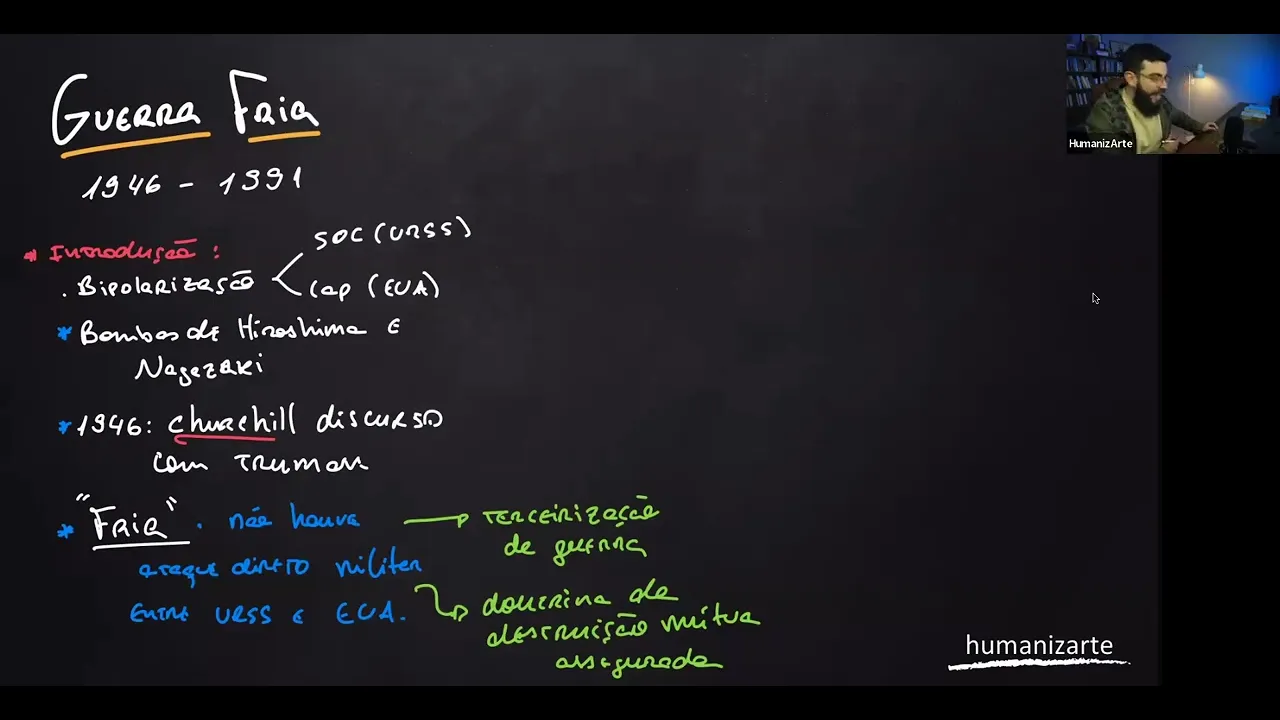 [Música] aí estamos gravando seguinte nossa aula de hoje é uma aula tensa é uma aula tensa né nosso conteúdo de hoje é o conteúdo de guerra fria em questão dos conteúdos tradicionais da história geral seria o último grande conteúdo né Depois de Guerra Fria a gente tá falando praticamente de atualidades a gente vai Est falando de temas como Primavera Árabe no século XX é um tema mais de geopolítica contemporânea nos conteúdos tradicionais a Guerra Fria encerra o nosso cronograma de história geral nosso objetivo então é compreender é relacionar Claro esse conteúdo com conteúdos que vieram