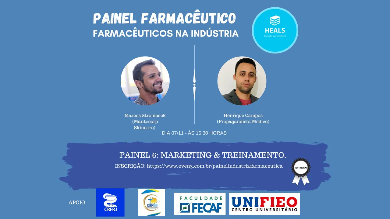 agora a gente traz dois temas que estão interligados né Principalmente de nós estamos falando do marketing e do treinamento dentro da indústria para você e nós trouxemos dois profissionais que estão profissionais mão na massa profissionais que estão trabalhando Atuando com isso e eles vão compartilhar um pouco para gente dessa experiência que eles têm temos aqui o Marco de droga que trabalha aí na Indústria Farmacêutica já há algum tempo na área de treinamento e nós temos também o Henrique Campos que atua como promotor médico bom então a ponta da Indústria Farmacêutica e o contato deste dessa