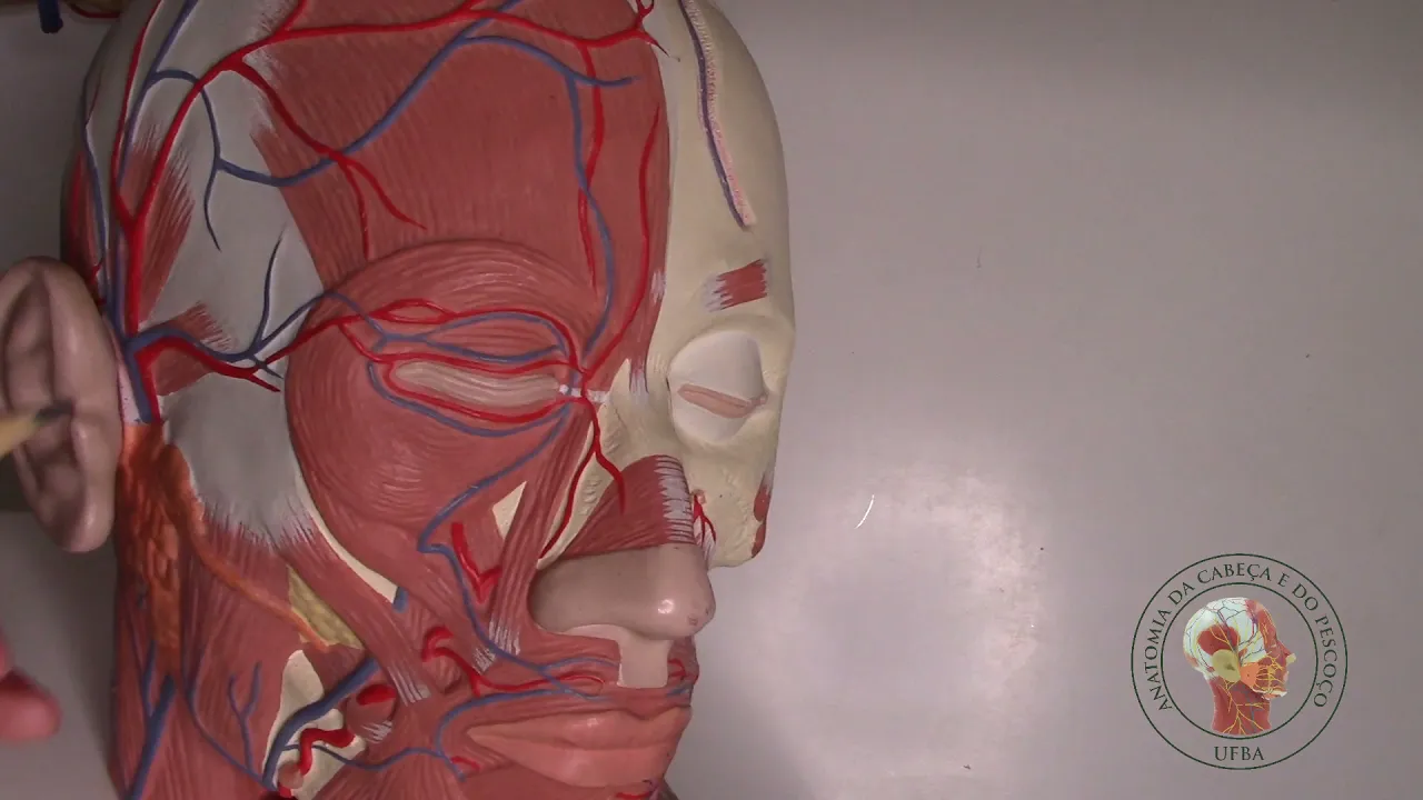frente da orelha vejam caso mergulhar aqui ó passando a paródia da cobre essas esses vasos por isso que a gente não vai ver mais nessa nesse modelo não vão passar atrás da mandíbula com as ruas nome fica e outra coisa importante da gente vê nesse modelo é a relação também da veia facial com artéria facial elas são correspondentes e passam aqui na face os Ramos têm os mesmos nomes né então a gente vê aqui ó a gente vê a veia facial Começando aqui Como verangular assim como temos aqui a artéria angular aí ela descendo aqui