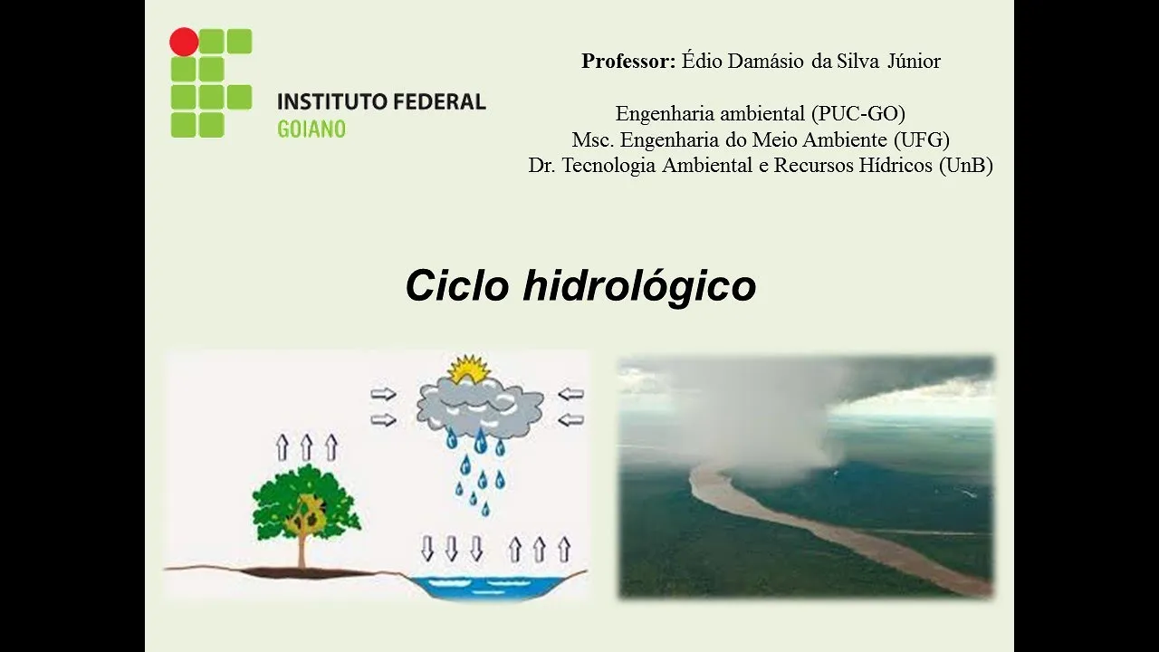 Goiano Campus Rio Verde engenheiro ambiental começar de doutorado na área de saneamento e também recursos vídeo ok e Isso isso vamos para o nosso primeiro encontro ali né quando a gente fala sobre ciclo hidrológico quando a gente fala sobre a água quando a gente fala sobre gestão de recursos hídricos né quando a gente pensa em água na natureza a primeira de todas as águas comendo de todos os assuntos que a gente tem que aguardar s Oi pode vir logo aqui na capa né dessa aula daqui de hoje a gente tem né uma figura ali que