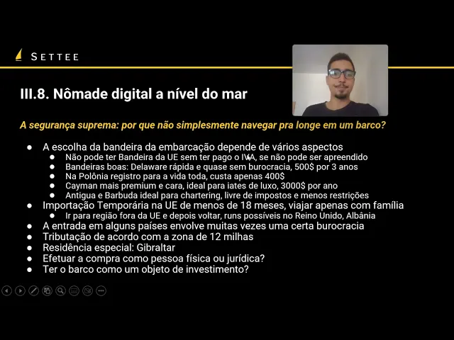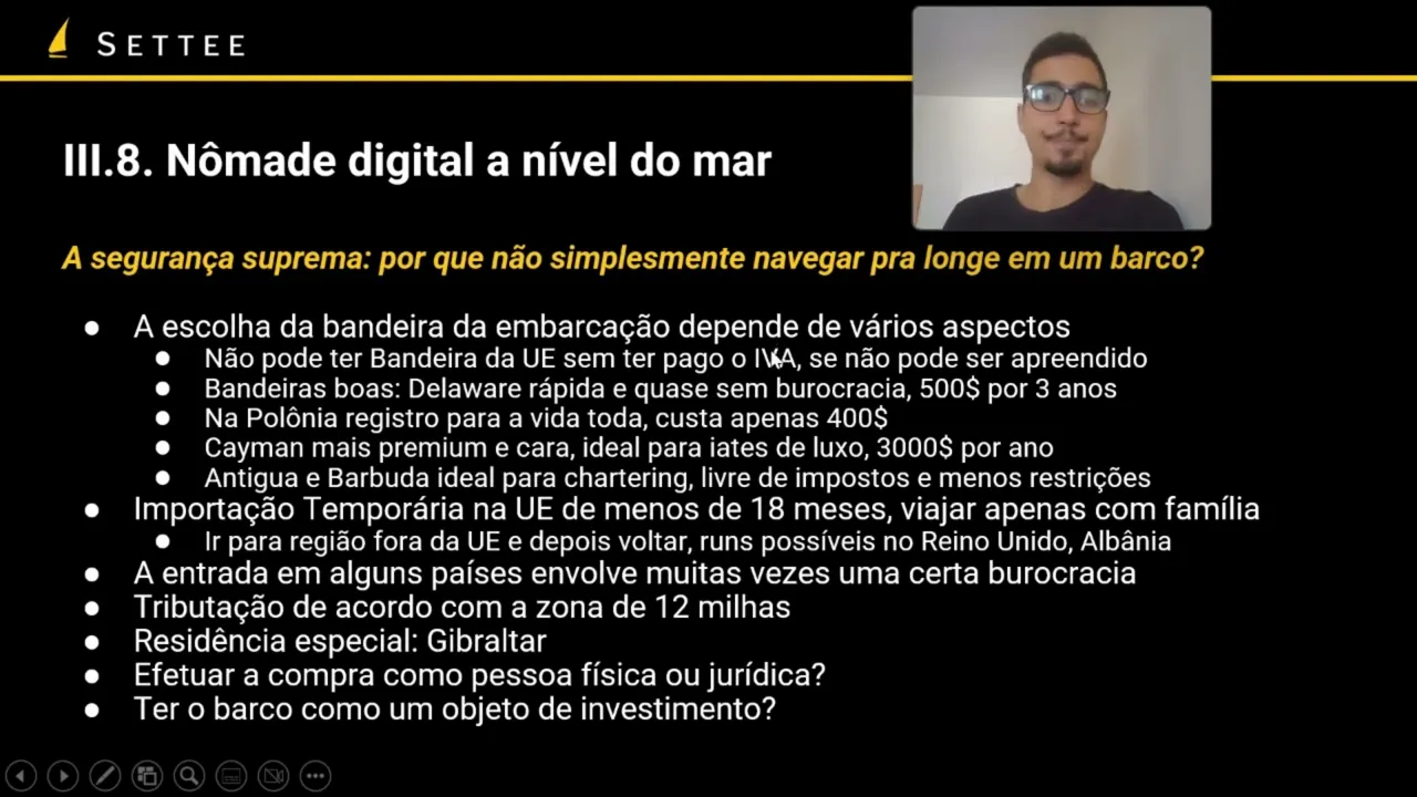 consegue utilizar isso para manter para fixar a sua residência fiscal em Gibraltar muito interessante para aqueles que precisam de uma residência fiscal que querem poder fazer uso também de fiscal para os propósitos que a gente já mencionou as aulas anteriores e bom tem o tema também né como que a gente vai efetuar a compra vai fazer com uma pessoa física ou jurídica isso vai depender muito do país que você é da bandeira da embarcação e também né do tipo de embarcação também o tipo de tributação que vai estar sendo aplicada no caso o status o