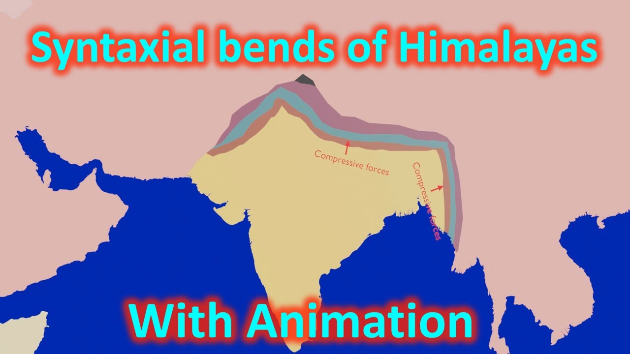 east to west Direction moreover during and nature of these forces also varied that is why mountains on the western edge are called kther mountains and suan mountains and they are not considered part of Himalayas the compressive forces on the western edge and the northern edge of Indian plate were acting in different direction therefore we see formation of syntaxial bends on northern eastern edge of Indian plate these syntaxial bends can be seen as bends in orientation of mountain chains moreover these syntaxial bands presence can be clearly seen in flow of Indus River which takes a sudden