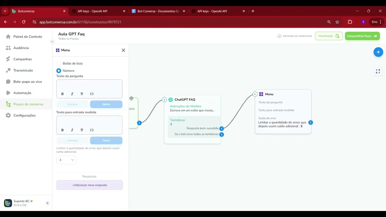 tá E vou colocar aqui o nome da chave clicar em Create a secr ke e aqui vai ter minha chave de api que eu vou copiar e vou colar aqui em configurações tá depois que eu colar eu vou clicar em salvar e aí ele vai fazer uns testes para ver se a chave de api tá válida pode demorar um pouquinho caso demore muito recarrega a página e tente novamente salvar agora foi a chave de Api para o chat IPT foi adicionada com sucesso Beleza então a gente pode fechar aqui as configurações e lá no fluxo