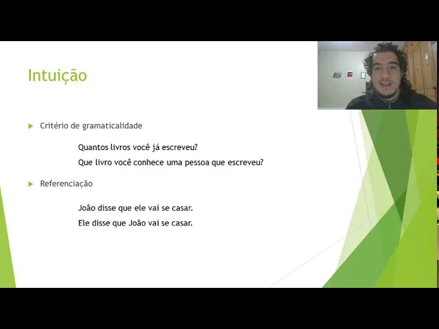 na língua oi e essa é uma construção né que eu vejo bastante fica frequente mas vai depender de uma pessoa para outra dizer se isso é ou não gramatical e eu particularmente acho que é uma frase gramatical mas daí você pode ver como que a noção de intuição linguística ela não é tão absoluta assim né mas é porque a gente está saindo daquela teoria behaviorista e para uma uma noção mais racionalista e todas em portaria referemse ação naquele dar dois exemplos de frases também joão disse que ele vai se casar ele disse que joão vai