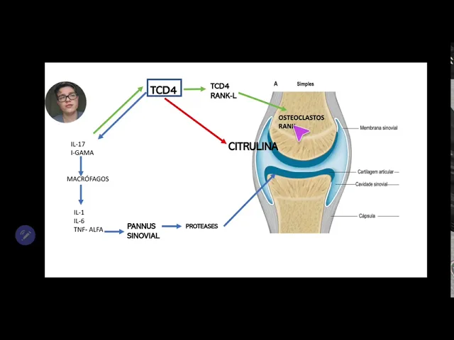 e vão começar a produção de anticorpos seja o fator reumatoide ou seja anti-ccp são bem característicos de pms presentes na doença quando a gente vê uma visão da sinóvia que essa região aqui a gente tem que entender que t cd4 eles vão encontrar a citrulina certo e eles vão começar então reações eles vão o tempo produção de citocinas inflamatórias e integrou-se na 17 interferão gama e tanto vai recrutar macrófagos como vai fazer um feedback para se esquecer de quatro esse feedback é importante porque porque ele faz com que o tcd4 ele expressa na membrana dele