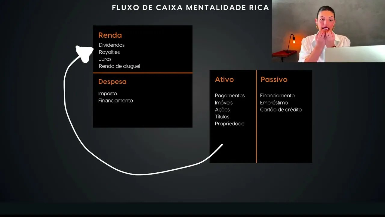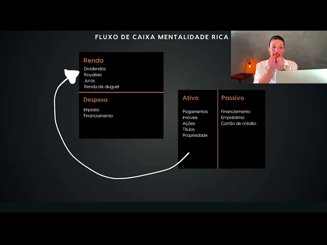 000 2500 ia para pagar o financiamento do carro o que dá aí em torno de uns 35% da renda dela perceba em torno de quase metade da renda dela indo para pagar um passivo para pagar o carro aí depois você já inclui aí aluguel ou financiamento da casa mercado filha né Ela tem uma filha então tem custos escola plano de saúde como que a gente vai incluir tudo isso dentro de uma vida o lazer a viagem então é muito importante tomar cuidado com os passivos que você vem acumulando Será que o quanto você paga hoje de financiamento de casa de carro faz sentido dentro da sua renda Será que se você conseguisse pegar algo um pouco mais barato por mês não te daria muito mais espaço para fazer uma viagem que você tanto quer para conseguir montar uma reserva para conseguir começar a investir pensando no longo prazo e aí por diante Pense nisso porque às vezes a gente tá com um carrão na garagem e achando que a gente tá mostrando pros outros quando na verdade a gente tá tomando quase metade do nosso dinheiro e se a gente não tivesse um carro desse tamanho se a gente tivesse um carro um pouco menos a gente estaria vivendo muito melhor tá no fluxo de caixa de mentalidade rica a gente já vai ver uma grande diferença e é aqui que eu quero que você chegue tá com o tempo vamos lá perceba que a mentalidade ó todos os outros começaram do emprego que tem um salário E aí vai ou por passivo ou vai direto para as despesas e acaba com o dinheiro já aqui na mentalidade rica não a gente pode perceber que o ativo ele a coluna do ativo ela é grande e ela é maior do que a coluna dos passivos então se você olhar aqui ó no ativo ele vai ter Imóveis ações títulos propriedade pagamentos tá esses pagamentos servem também como um salário uma renda um prolabore sim porque essa pessoa também tem que trabalhar quem tem mentalidade rica também trabalha gente não tem como a gente ganhar dinheiro sem trabalhar é ilusão achar que a gente vai ficar rico sem trabalhar o trabalho é o que te traz dinheiro e do desse dinheiro você consegue depois seguir toda a sua vida então é isso eu quero que você entenda aqui tá como que a gente se transforma numa pessoa rica de fato construindo uma coluna de ativos que nos dê renda dividendos royalties aqui por exemplo se você investisse numa empresa ou algo do tipo juros se juros vem de investimentos renda de aluguel Claro seu salário Como eu disse antes o seu prolabore tá então a mentalidade rica ela faz o que de diferente dos outros ó perceba ela ainda tem passivos ela tem financiamento ela tem cartão de crédito ela tem despesas ela tem ela é óbvio ela é uma pessoa que tem que pagar conta só que ela não coloca todo o seu dinheiro na coluna dos passivos ela simplesmente monta uma coluna dos ativos e esses ativos geram mais renda com mais renda ela consegue e aumentar esse essa coluna que gera mais renda ela aumenta essa coluna E aí elas até chegar num até chegar em uma bola de neve que vá permitir que esse dinheiro dinheiro que vem para ela aqui dos ativos aí assim eliminando o trabalho dela de Fato né Depois de alguns anos sem considerar o trabalho ela est lá todo dia trabalhando ela já vai ter renda caindo na conta dela ela tem dinheiro que cai na conta dela todos os meses exemplo supor que ela acumulou lá cinco imóveis de aluguel cada imóvel ela ganha 2. 000 de aluguel ela tem 10. 000 por mês sem fazer mais nada só que ela teve um período de acumular isso não foi da noite pro dia que ela foi lá e comprou cinco Imóveis e o Rua agora ela não trabalha mais e claro ela pode continuar trabalhando por escolha não por obrigação ela pode talvez Trabalhar em algo que ela gosta mais trabalhar menos se dar mais alguns luxos por exemplo Então mas claro que o imóvel é algo mais complexo da gente conseguir porque é mais caro né então Eh investimentos é uma ótima porta de entrada quando a gente pensa em fundos imobiliários tesouro ações são baratos de comprar você consegue comprar de forma barata com 10 20 30 30 R 50 claro vai ter de 100 200 sim mas já você começa a conseguir comprar já com r$ 1 e isso vai começando a aumentar a sua coluna dos ativos para você chegar aqui você tem que conseguir organizar o seu dinheiro você não vai chegar aqui sem organizar o seu dinheiro por isso que o código do dinheiro vai ser excepcional para você porque Qual é a intenção aqui a intenção é que você consiga alinhar o seu dinheiro crier um sistema inteligente de gastos que permita que você direcione o seu dinheiro para onde você quer que ele vá e não que ele simplesmente saia fugindo de você e você nem viu para onde ele foi ao longo do mês você vai direcionar ele para onde você quer que ele vá e dentro desses direcionamentos você vai incluir o quê os seus investimentos primeiro reserva depois a gente pode pensar em outros tipos de investimentos que são as metas né E se você tiver dívidas tá então se você tem dívidas parte do dinheiro que a gente vai destinar pros investimentos também vai pra dívida Tá mas isso você vai aprender depois paraa frente no módulo de dívida O importante agora é você construir uma vida financeira saudável então na qual você vai entender ali a sua receita as suas despesas e consequentemente quando você entende ali suas receitas e suas despesas você vai criar uma vida financeira saudável talvez não é o que aconteça hoje mas você vai planejar uma vida financeira saudável já no Próximo módulo você vai aprender a fazer isso você vai planejar então a sua vida financeira saudável uma vida financeira na qual você ganha gasta tem dinheiro pro mercado pro lazer pro aluguel pra energia para viver bem mas ainda assim uma parte do seu dinheiro sobra Então você vive um degrau abaixo da sua renda O que é viver um degrau abaixo da minha renda se eu ganho cin eu não vou gastar seis e se eu ganho cinco eu não vou gastar 5.
