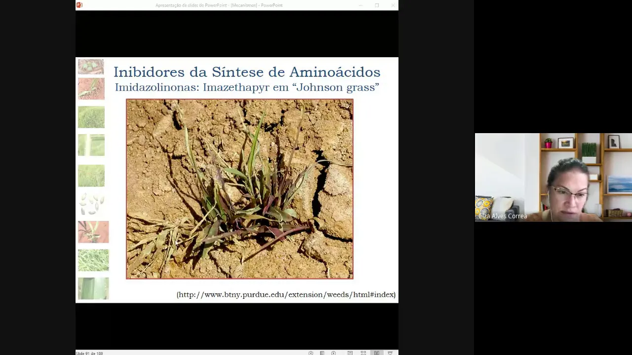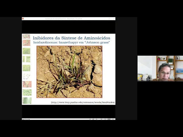 o Olá pessoal tudo bem bem-vindos A Mais uma aula de plantas daninhas e métodos de controle e eu sou Professora Elza correia da Unesp de registro E hoje vamos continuar falando dos inibidores de reação de biossíntese de mecanismo de ação de herbicidas né Falando de inibidores da reação de biossíntese falaremos agora sobre os inibidores da síntese de aminoácidos a focados naqueles inibidores de acesso lactato sintase acetolactato sintase enzima é responsável pela formação né uma das enzimas obviamente responsável pela formação dos aminoácidos de cadeia ramificada tá falávamos anteriormente né sobre os inibidores de aminoácidos aromáticos agora