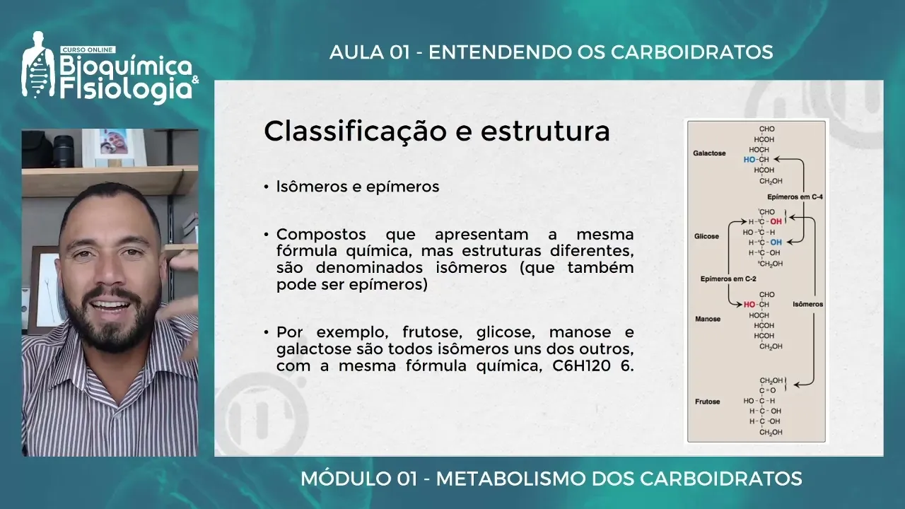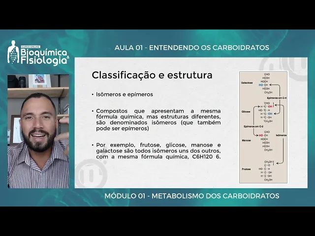 Olá tudo bem seja muito bem-vindo a mais uma aula nessa aula nós iremos entender o que que são as moléculas de carboidratos que que na verdade o que que é um carboidrato Você já parou para pensar sobre essa questão tão tão tão simples né tão básica antes da gente entender e discutir os papéis metabólicos dos carboidratos a gente vai entender o que que são na verdade esses compostos certo então A ideia é a gente entender forma um carboidrato Por que carboidrato é chamado de carboidrato olha só que interessante Quais as diferenças entre os principais tipos