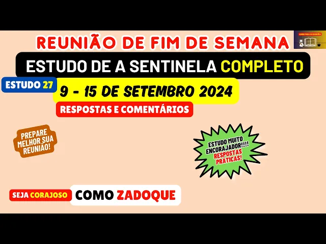 Neste vídeo Vamos Fazer Uma Breve análise e preparação do estudo 27 da revista Sentinela que vai ser considerado na reunião deste fim de semana 9 a 15 de setembro [Música] o estudo 27 tem o seguinte tema seja corajoso como zadoque tem como base primeiro crônicas Capítulo 12 Versículo 28 que diz zado Foi um jovem Valente e corajoso qual vai ser o objetivo do estudo o que vamos ver e analisar neste estudo vamos ver como o exemplo de pode nos ajudar a ser Corajosos parágrafos 1 e 2 a pergunta Quem foi zadoque com base em primeiro