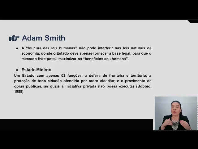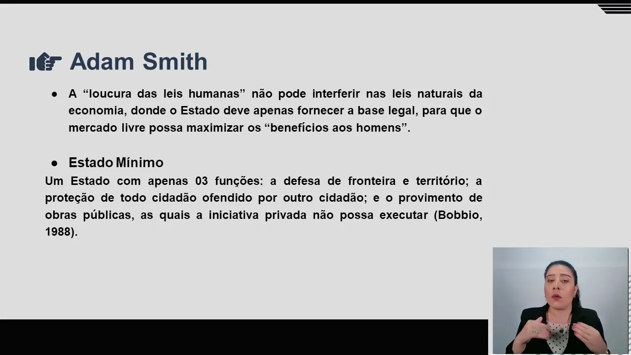 Ele dizia que não pode interferir nas leis naturais da economia, de onde o Estado deve apenas fornecer a base legal para que o mercado livre possa maximizar os benefícios do homem. E aí Adam vai dizer que o Estado tem que ser mínimo e ele tem que ter apenas três funções: a defesa da fronteira e território, a proteção de todo cidadão ofendido por outro cidadão, e o provimento de obras públicas às quais as iniciativas privadas não possam executar. Então, como é que ele pensa nesse processo?