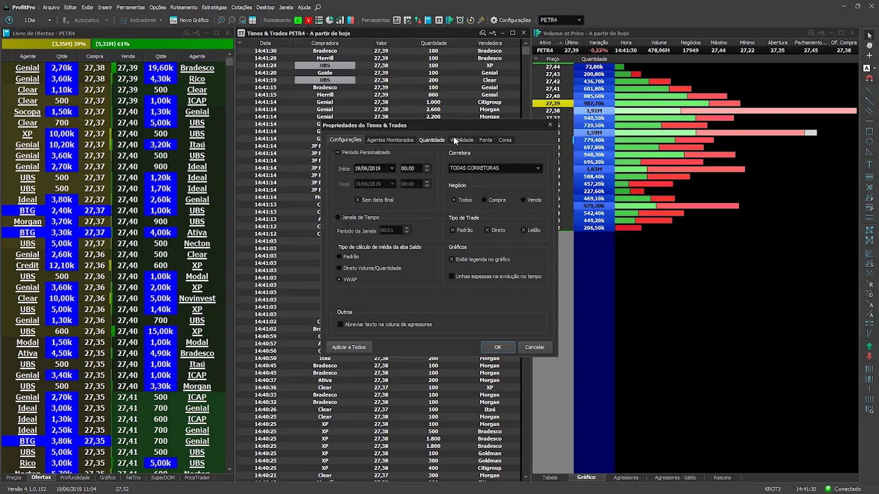 com o botão direito em propriedades não pode realizar em continuar já que o mesmo monitoramento por tamanho de trade por exemplo de maiores ou iguais a 20 na coloração azul e também em propriedades realizar o monitoramento player então aqui também btg para monitorar todas que espera aparecer já ocorrera com o monitoramento deste player toque você consegue ver a força de compra e venda do mercado para finalizar o volume traz é a ferramenta que vai mostrar pra você era bem fácil simples onde são os acusa o mercado onde houve alta negociação onde houve regiões em que