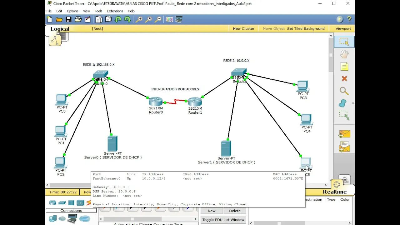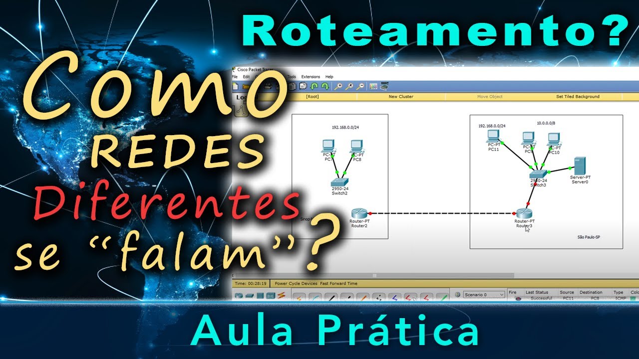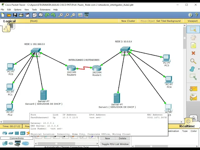 Oi e a gente eu preciso falando como nós já havíamos conversado com vocês antes fizemos aqui o vídeo da interligação dos dos números e pés dos componentes para gente montar essa rede é e como eu disse para vocês entre aqui os dois roteadores praticamente nós teremos essas duas vezes aqui quase que todas as aulas porque este meio aqui é o meio que nós vamos estar estudando fazendo alternativas inserindo O componente tiramos comportando componentes para estudar as nossas disciplinas Beleza então vou mostrar para vocês como só que foi construído nós já conversamos várias vezes esse vídeo para vocês fixarem mais e mais como essa pequena construção dessa pequena rede com dois roteadores é um falando com outro sendo que a primeira rede está no 92 EA segunda rede está no 10 ok atente-se para esse detalhe vamos ao nosso primeiro passo foi o quê com os trens um servidor a distribuição dos endereços de IP entre as estações tanto na rede 92 como na vida de 10 e como é que eu construí servidor o primeiro passo eu clico naquela opção dele e vem aqui na opção de desktop Ok IP configuration aqui é a primeira a primeira situação que eu faço com ele eu tenho que colocar o endereçamento fixo nele por quê Porque ele vai ser a pessoa que vai me distribuir p e nesse caso nós colocamos Quais as numerações nós 26805 é o IP dele a subnet quando nós clicamos aquela já vem automática 9216 8. 0. 1 é o IP do Gateway em lembra quem for subir mente e 19216801 6 é o IP do DNS server que nas próximas horas nós vamos utilizar criando mais outras estruturas baseadas nessa que após a configuração da imóvel estático servidor eu venho Não servidor mesmo e são myconfig veja que aqui existem vários itens Eu quero uma realidade somente fazer o que configurar e servidor para que ele distribuo os números e pés entre as estações Então nós vamos aqui em DHCP vejo que abrir essa tela aqui Geralmente eu coloco em off então eu vendo as configurações aqui coloca o de foguete que aquele número gay que que eu coloquei nele lá ok o DNS server que também Aquele número que eu coloquei a princípio nele e vou criar uma regra lembro da regra Então essa regra no nosso caso eu coloquei para estar a partir do IP do endereço 10 ou seja e será distribuído o Som IP com o endereço acima de 10 para as estações ok e é lógico existe uma outra é existe más condições de análise porque esses seus endereços mais acima que não podem ser utilizados mas o nosso caso neste momento para vocês basta você esteja essa informação aí depois nós vamos conversar com mais calma sobre outros assuntos após configurarmos aqui é esse número Maximum Number of users vocês podem deixar assim mesmo ele tá dizendo que pode até 246 vagas mas nosso caso não alterar né até porque nós fazemos três estações ligadas Ok clique em save e esta regra criada que ela já veio aqui para baixo se pode analisar que ela já vem para baixo essa regra criada vamos clicar em um servidor e feche a tela pessoal fechando essa tela né é ciúme entendeu que você já montar essa estrutura seja três computador o servidor no switch e esse roteador desse lado e deixa outro lado também ele só não tão estão interligados a partir do momento que você está tão servidor aqui com essas configurações que você colocar o mouse em cima ele já disse para você Quais as configurações que ele tá inclusive esse a placa fecha a Internet dele está em meu que eu não limpo você só vem em todas as estações equipe configuration e geralmente deve estar estático e se você colocar em DHCP alguns minutos ele já vai pegar essa informação Ok por exemplo vou colocar estático aqui e ele tá pedindo para que eu digite o número mas é verdade nós temos um servidor então isso tem que pegar ele forma automática com ver se tá pegando de forma automática clica no DHCP a beleza pegou a numeração que o servidor de DHCP distribuiu então pegou 11 com as configurações que ele distribuiu vamos ver os seus computadores e 60 e 70 Ok você chama aqui no PC 1 PS1 pegou dez ok então nós temos lá 11:10 ok e não PC dois ele pegou o doce e o restante das configurações são iguais porque é o que o DHCP está distribuindo de fixo só o IP de cada Estação pessoal nesse momento que muda e veja bem esse Range dessa primeira rede ou repetir um arranjo 19216801 alguma coisa OK então toda essa ação que nós construímos para cá nós vamos repetir para esse servidor vamos ver o IP de servidor como é que está veja aqui ó e o IP de servidor é 10.